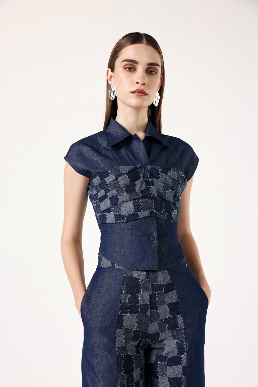 Refresh your summer wardrobe with our Premium Denim Sculpt Top, designed to combine style and comfort effortlessly. Crafted from breathable denim jacquard fabric, this top features a striking color-blocked design that adds a contemporary edge to your look. The body-fit silhouette highlights your shape while ensuring ease of movement, thanks to the smart side zipper opening that makes it effortless to wear and remove. A delicate pleat detail on the front adds a touch of sophistication and visual interest, elevating the overall design.