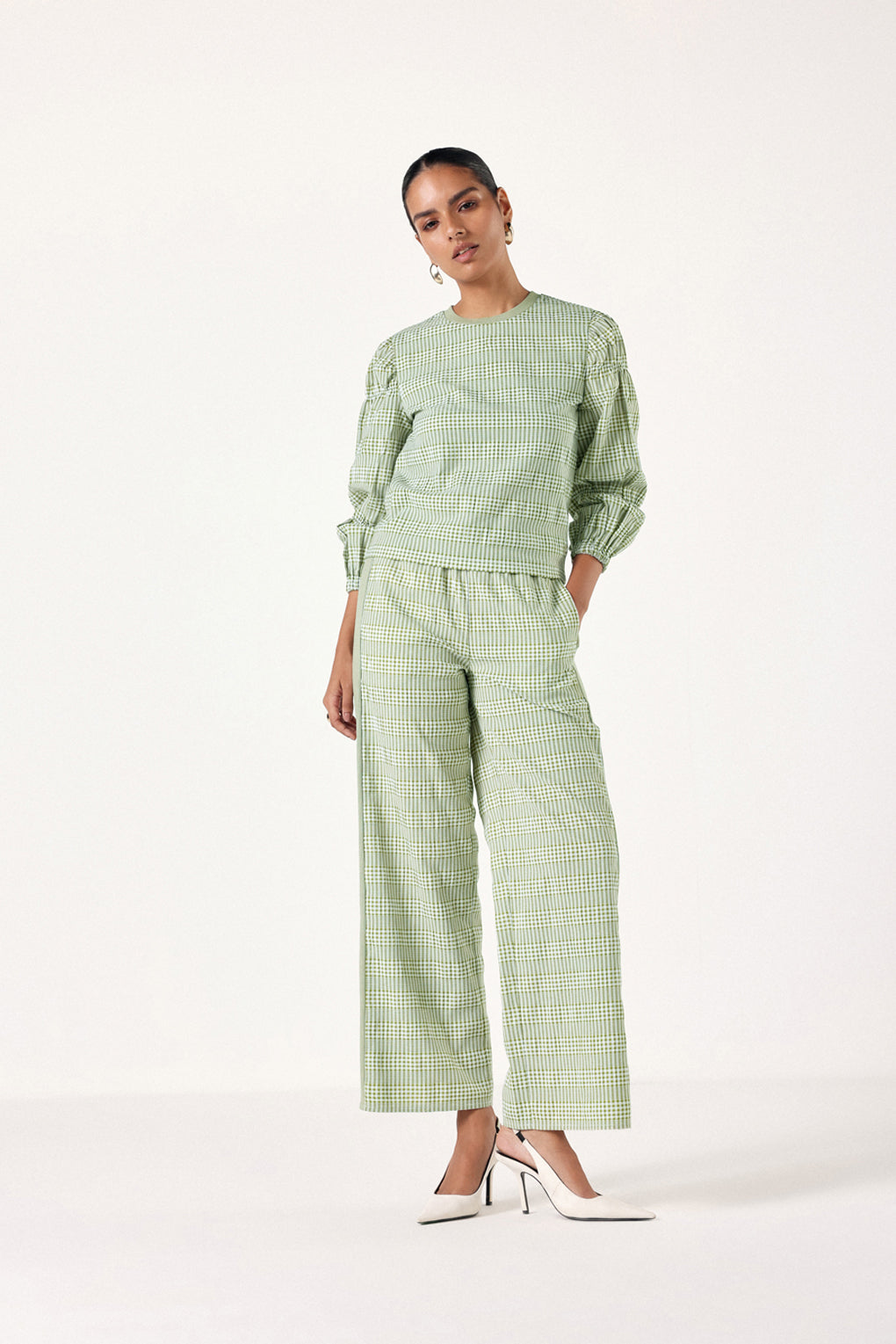 Step into effortless summer style with this women’s premium co-ord set crafted in breathable seersucker patterned check fabric. The top features a comfortable ribbed round neckline and beautifully designed puff sleeves that add a touch of charm and femininity. Paired with coordinated wide-leg pants that offer a relaxed fit, detailed with a flattering paperbag-style smocked waistband and sporty ribbed side panels for added comfort and a modern twist. Lightweight and stylish, this set is perfect for sunny days and breezy evenings.