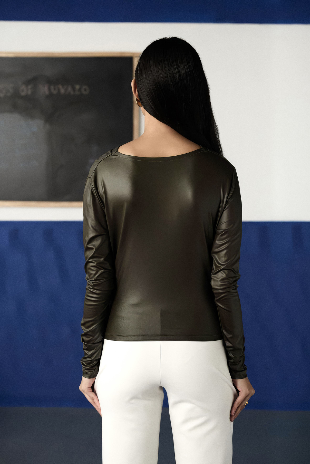 Crafted in a luxe leather-look fabric, this full-sleeve top brings effortless sophistication with a modern edge. The soft draped neckline adds fluid elegance, balancing the sleek, sculpted fit of the silhouette. Designed to feel smooth on the skin while delivering a polished, high-fashion finish, this top pairs seamlessly with trousers, skirts, or layered looks—making it a versatile statement piece for any wardrobe.