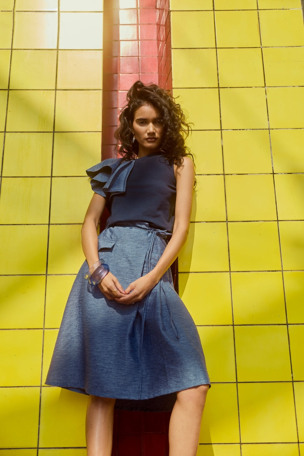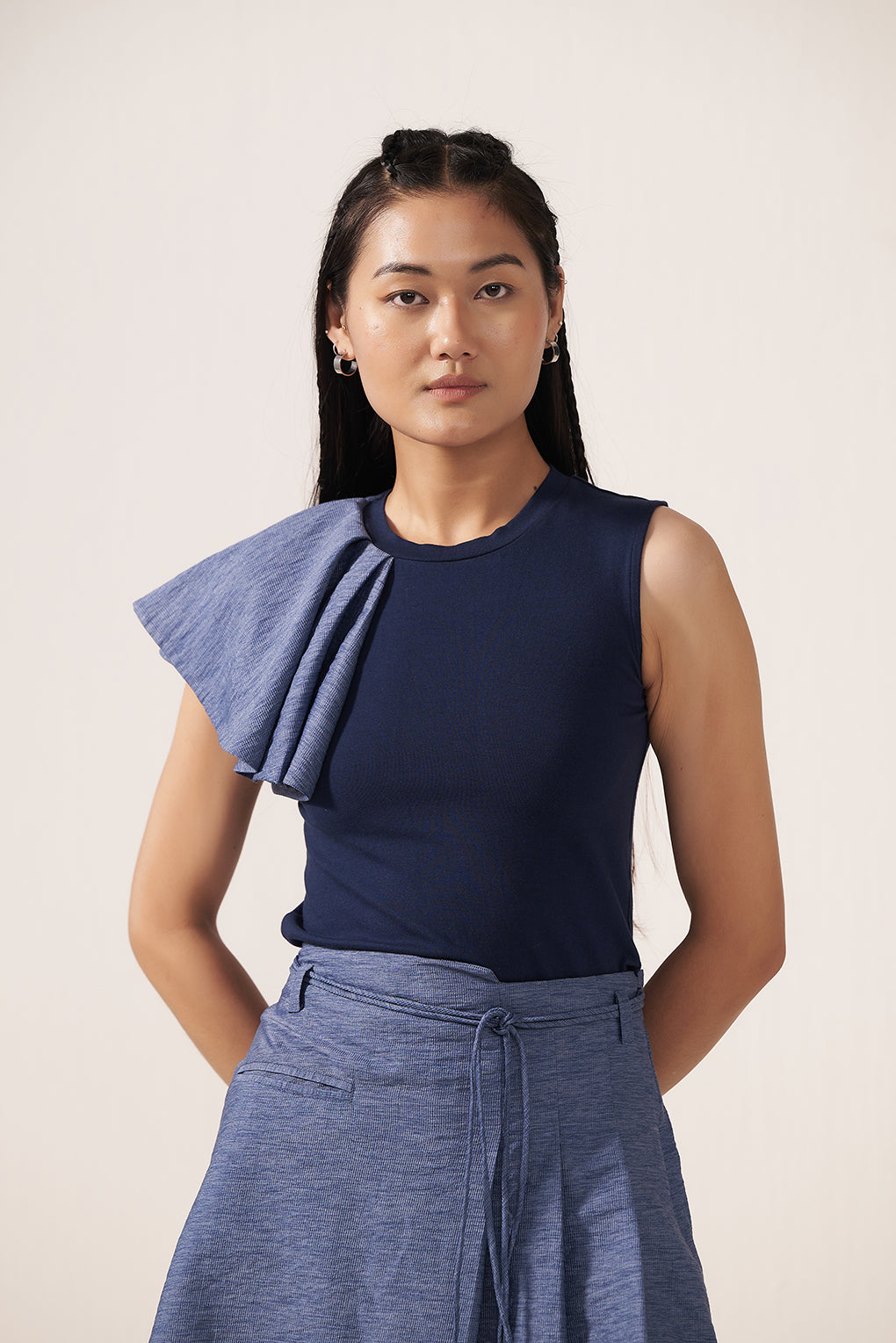 Elevate your wardrobe with this navy blue sleeveless top, featuring a sophisticated round neckline and a dramatic layered ruffle cascading diagonally across one shoulder. The tailored yet softly draped silhouette exudes modern elegance, while the minimalist body ensures the statement shoulder remains the focal point. Perfect for refined daytime looks or evening occasions, this top pairs effortlessly with tailored trousers, skirts, or wide-leg pants.