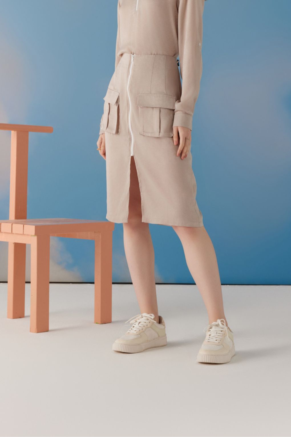 Explore sophistication with our Silken Stride zip-up skirt, featuring intricate 3D pocket details that add a touch of modernity to your ensemble. The fabric texture will captivate you with its incredible feel, ensuring style and comfort in every wear. Elevate your wardrobe with this chic and versatile piece, perfect for any occasion.