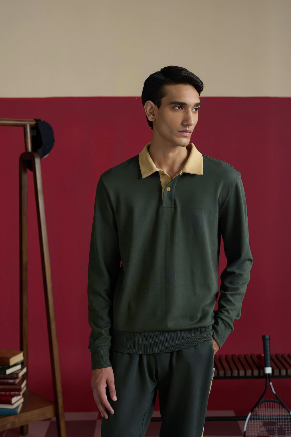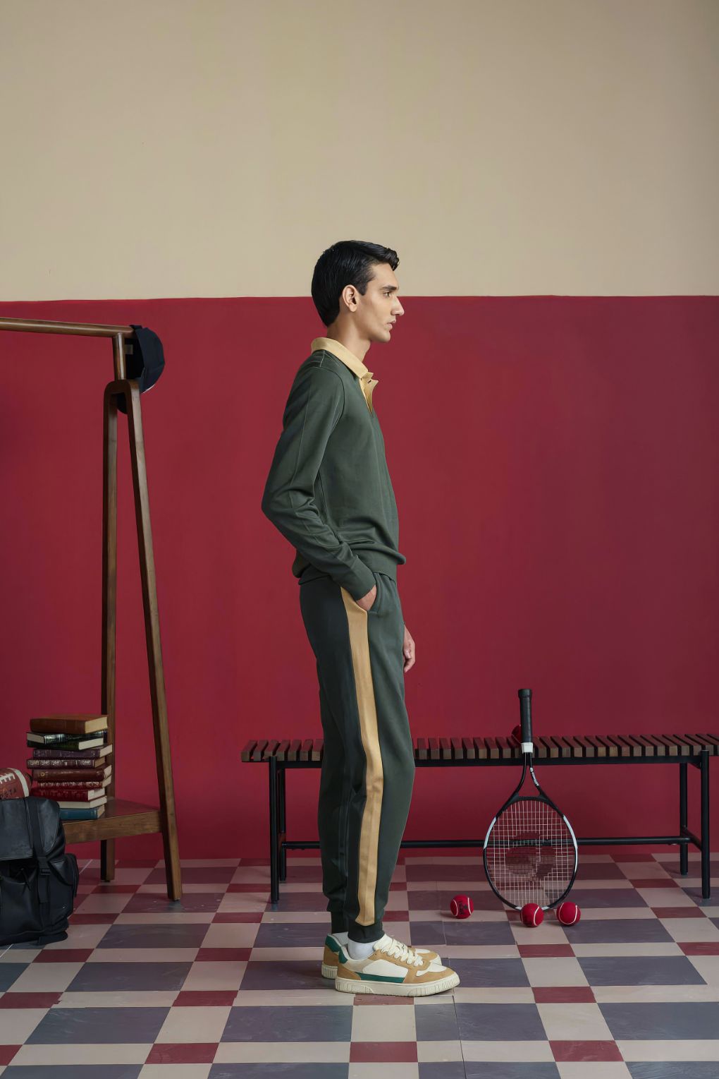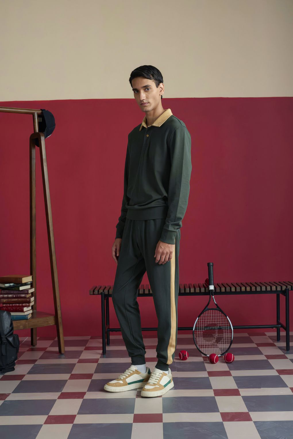 A refined athleisure look crafted from soft mid-weight knit fabric, this set includes a long-sleeve polo with a contrasting tan collar and matching joggers featuring a bold tan side stripe. The polo offers a clean silhouette with a classic button placket, while the joggers provide a comfortable elastic waistband and ribbed cuffs for a modern tapered fit. Perfect for casual outings, sports, or relaxing in style.