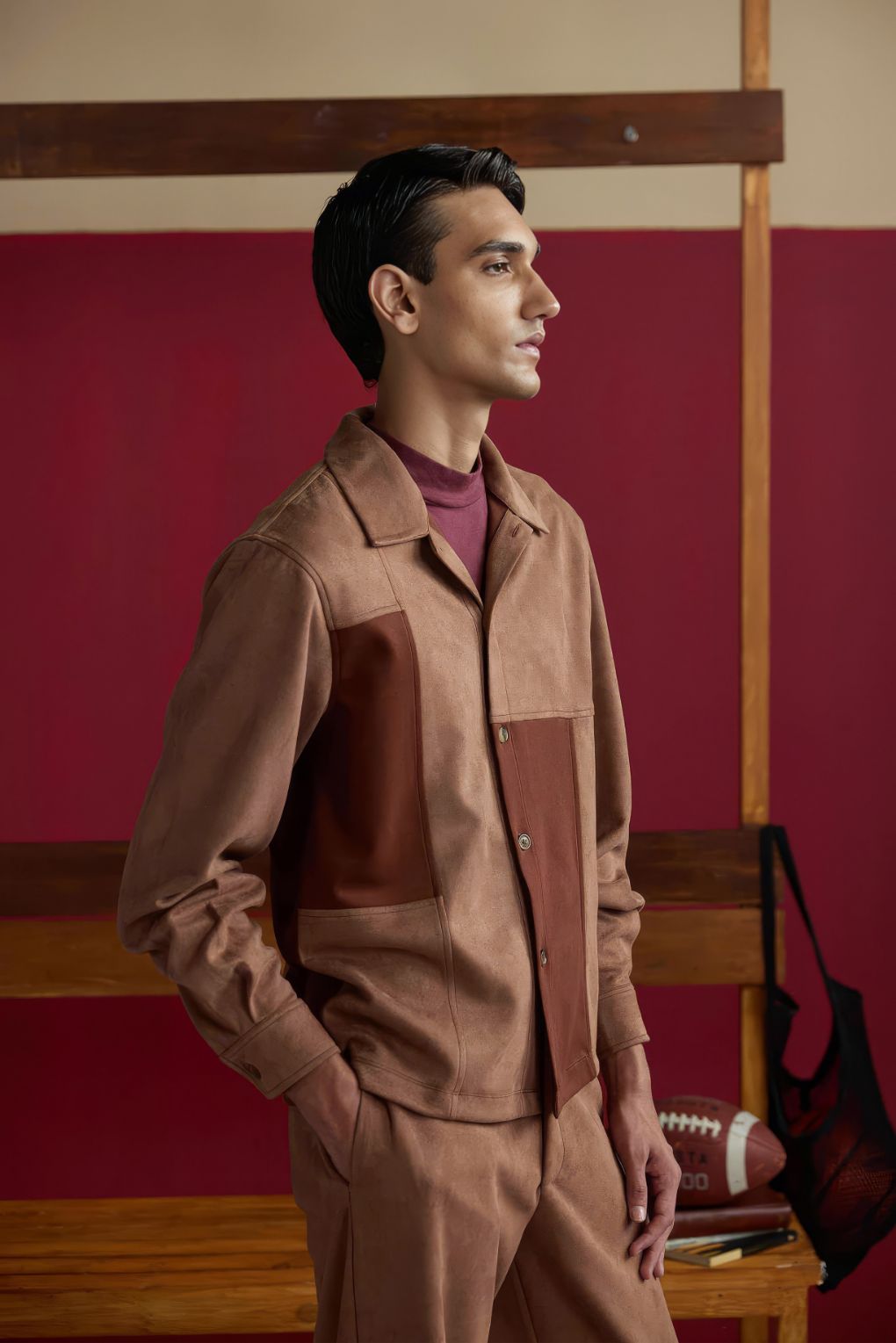 Elevate your wardrobe with this men’s co-ord set crafted in luxurious suede fabric. The full-sleeve shirt features a bold color-block design , while the straight-leg pants deliver a clean, structured silhouette that balances comfort with refinement. Together, the set creates a statement look that fuses modern edge with timeless sophistication—versatile enough to wear as a complete outfit or styled separately for effortless elegance.