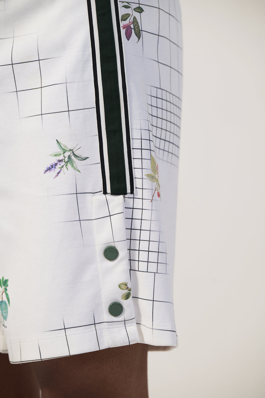 White shorts featuring a subtle grid pattern accented with delicate floral motifs. Designed with an elasticated waistband and a relaxed cut, they offer comfort without compromising on style. Contrast side stripe detailing adds definition and a contemporary, structured finish.