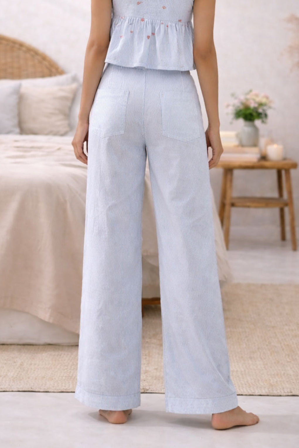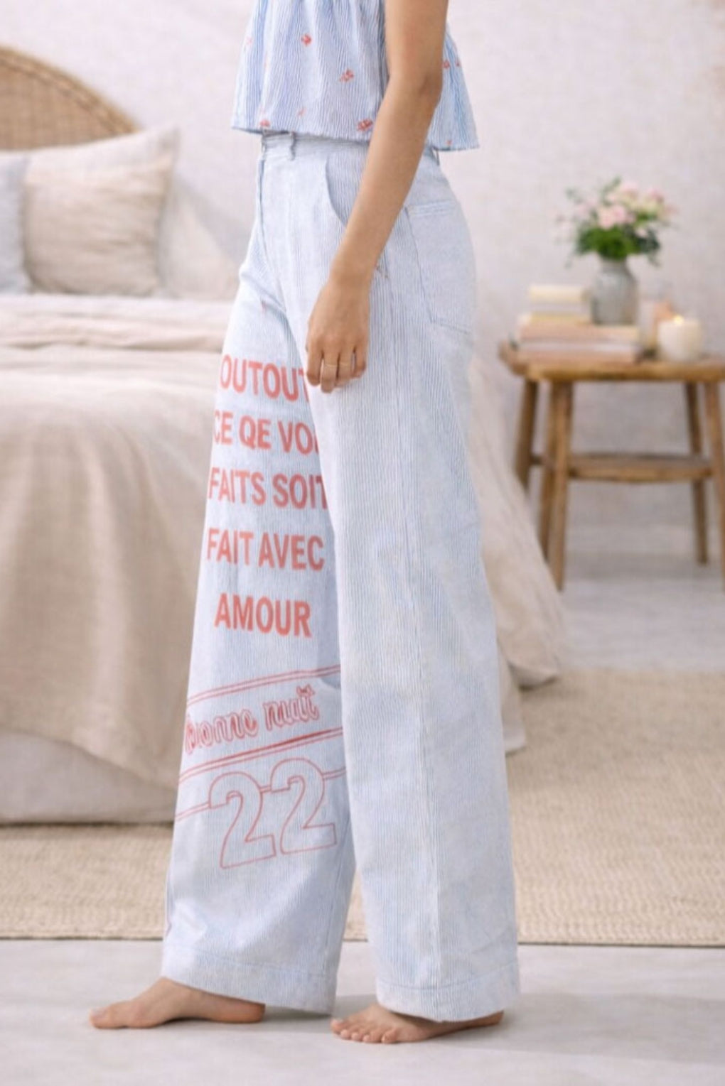 The Bonne Nuit 22 Pyjama is crafted from 100% cotton satin, set on a crisp white base with soft light blue stripes and finished with a statement French print on one leg that reads, “May all that you do be done with love.”