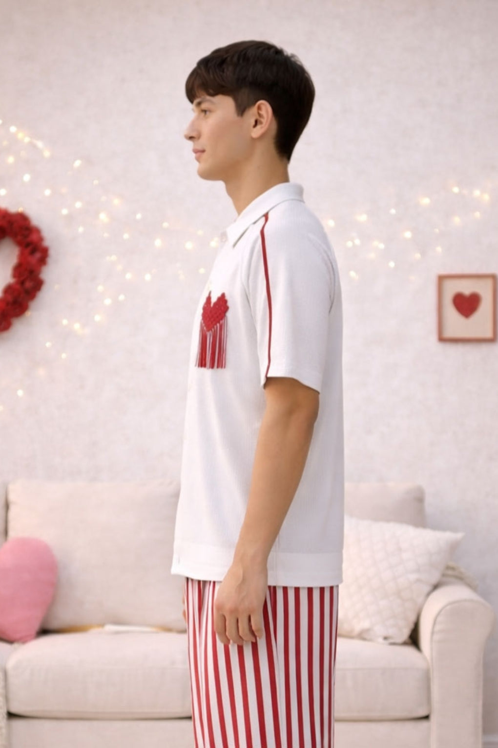 - Design Detail/Trim: Buttons + Viscose Macrame Heart Badge.