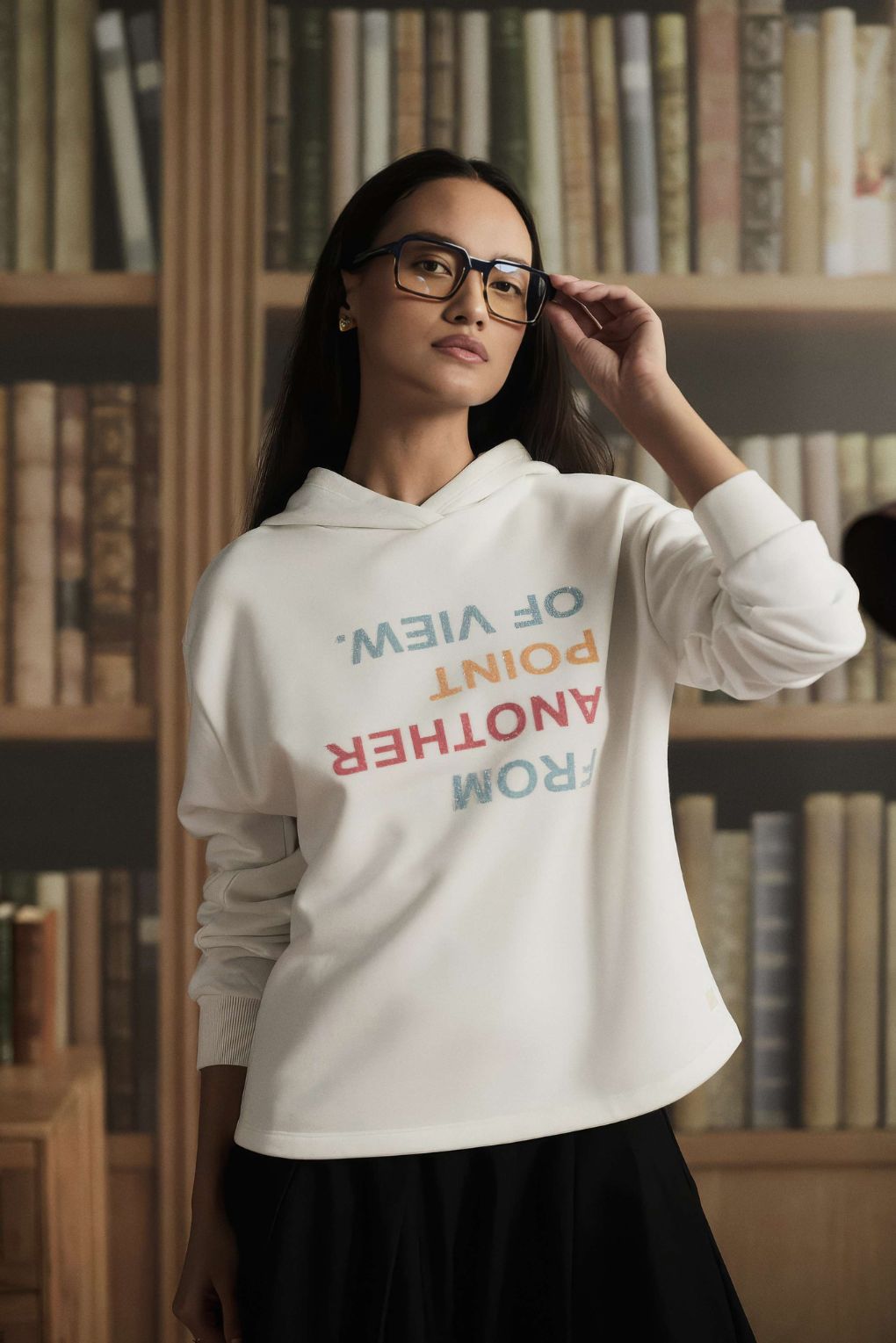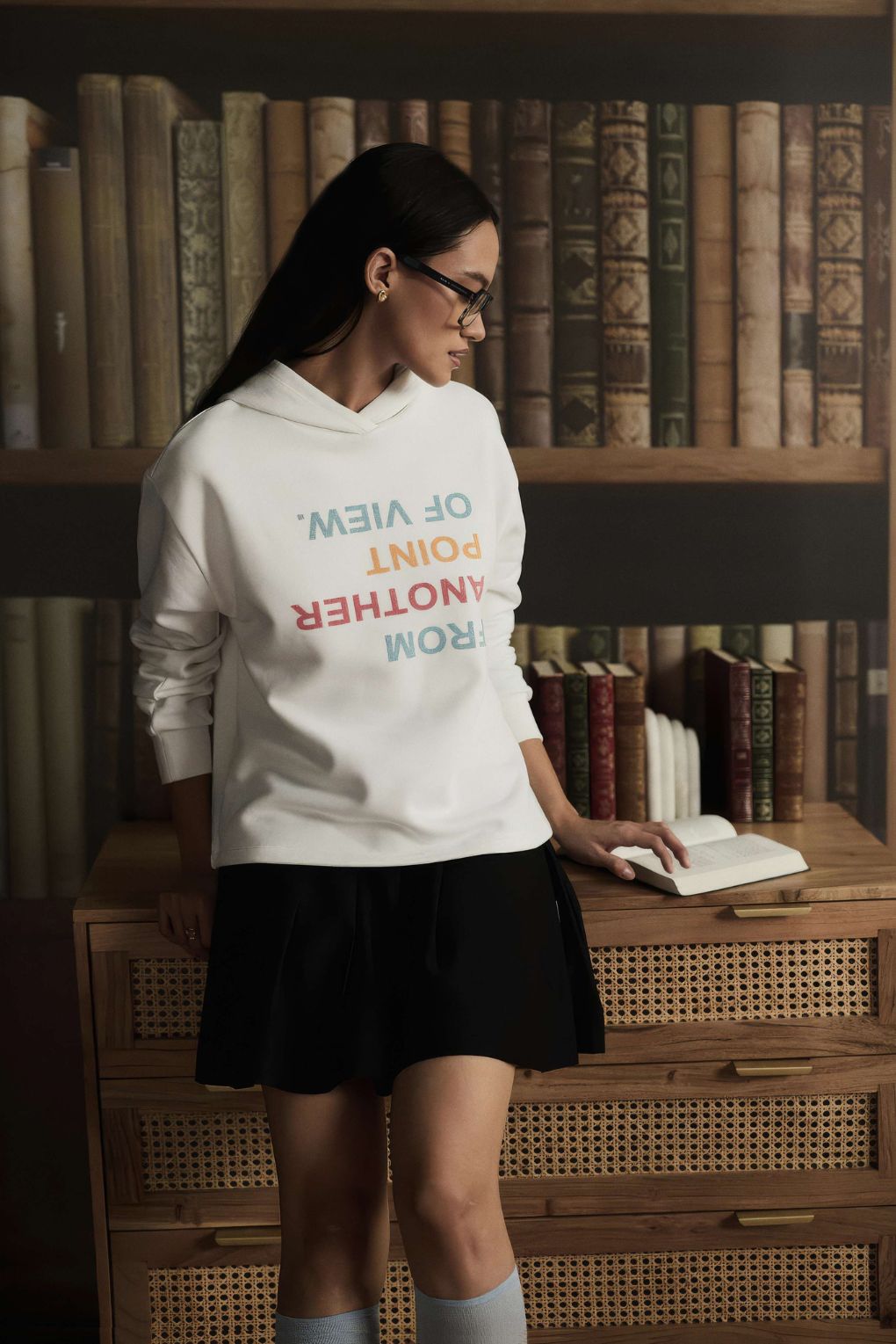 Cozy meets statement style in this women’s regular-fit hoodie sweatshirt, crafted from luxurious premium fleece fabric for ultimate warmth and comfort. Featuring our signature text print embellished with multicolor caviar bead detailing, it adds a playful yet refined sparkle to your everyday look. Designed with a classic hood and soft silhouette, it’s the perfect choice for chilly days, bringing together effortless comfort and eye-catching charm.