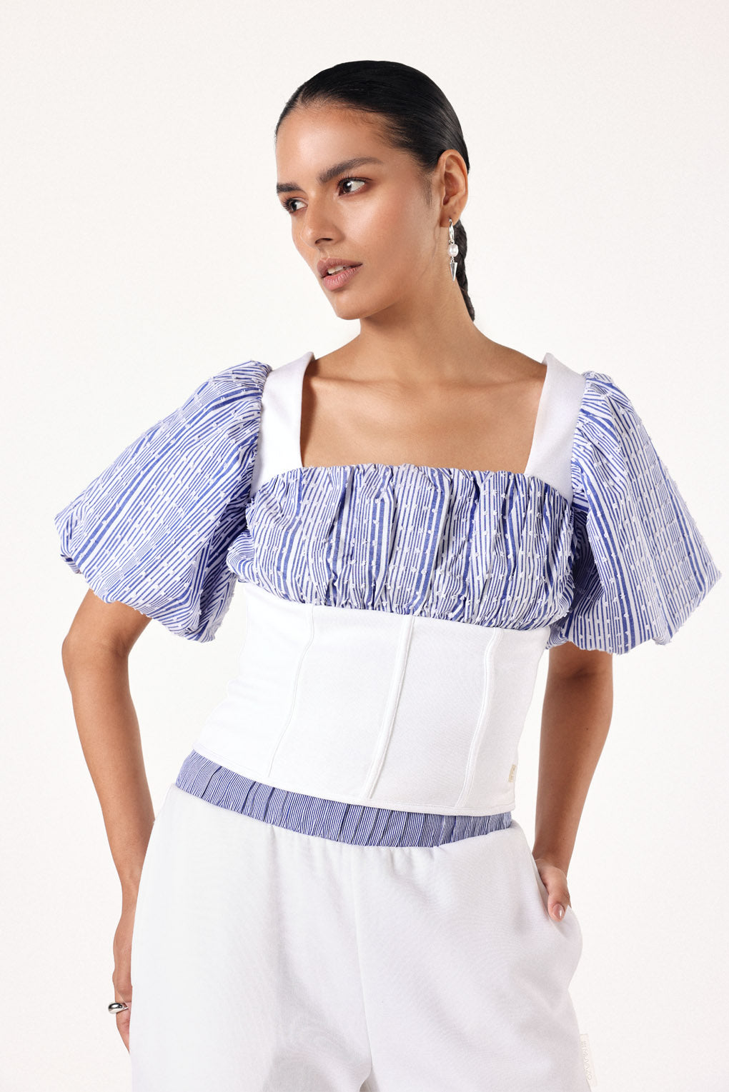 Turn heads in this effortlessly chic, corset-inspired top. Designed with a flattering neckline and elegant blouson sleeves, it strikes the perfect balance between soft femininity and structured style. Delicate shirring at the bust enhances the silhouette, while the fitted waist creates a cinched look that mimics the shape of a classic corset—without sacrificing comfort. Ideal for dressing up or down, this versatile piece adds a touch of drama to any outfit.