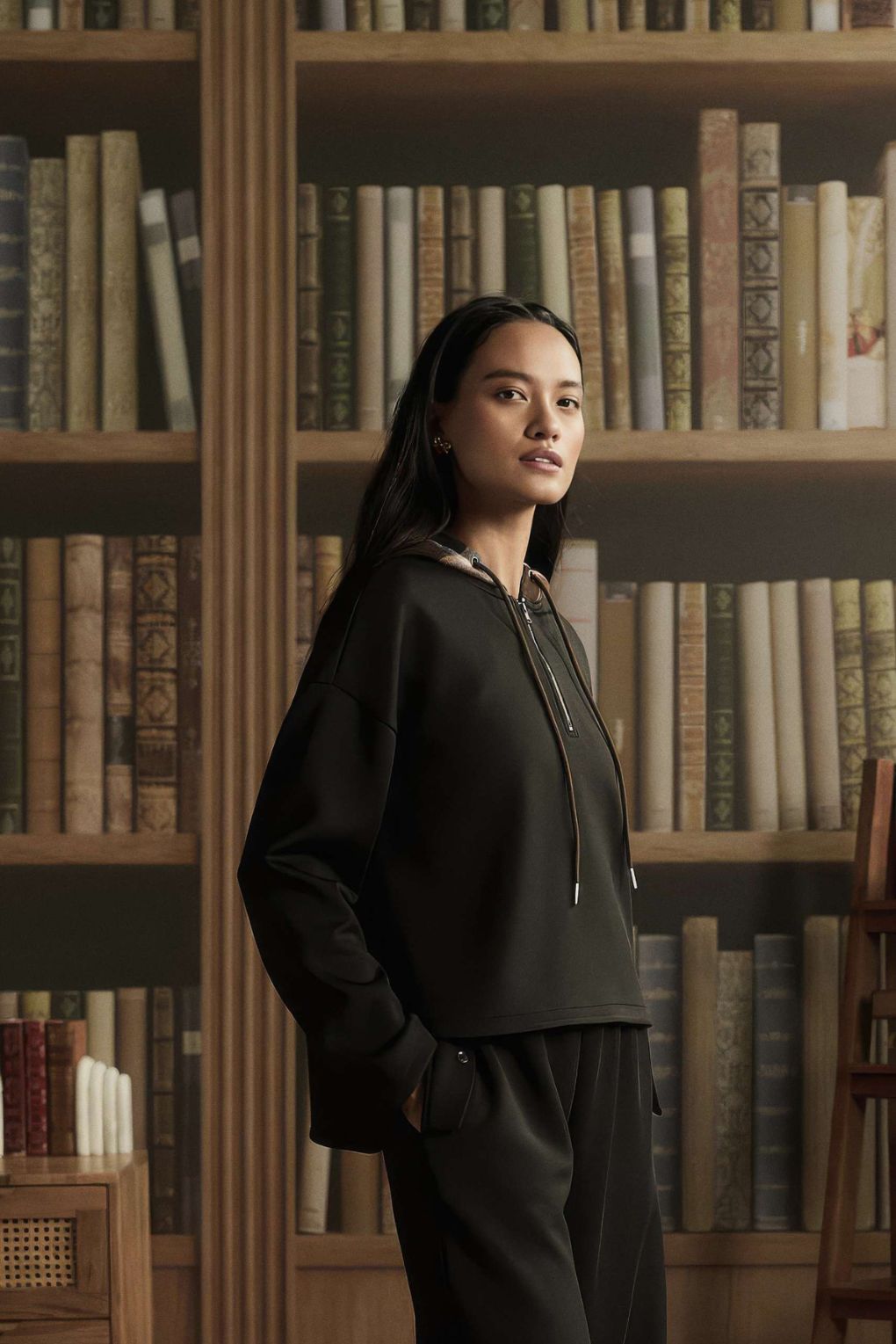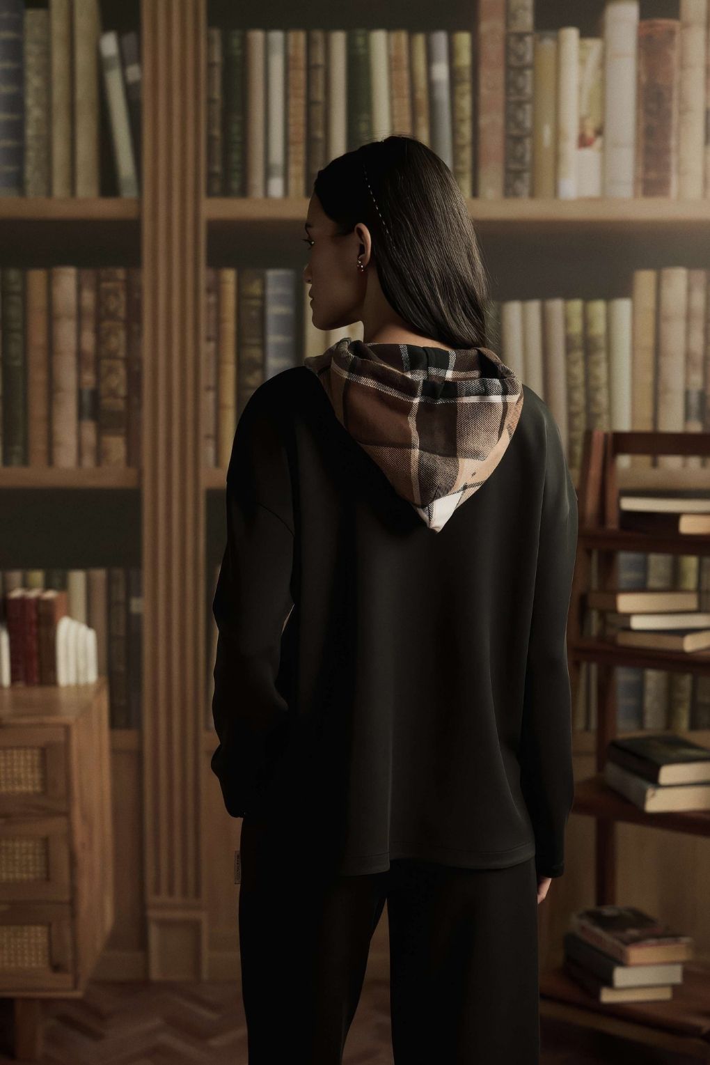 This modern-meets-cozy top is where street style meets everyday comfort. Crafted from structured scuba fabric, it offers a clean, smooth drape with a touch of stretch, while the contrast woven brushed check hood adds a warm, rustic twist to the contemporary silhouette.