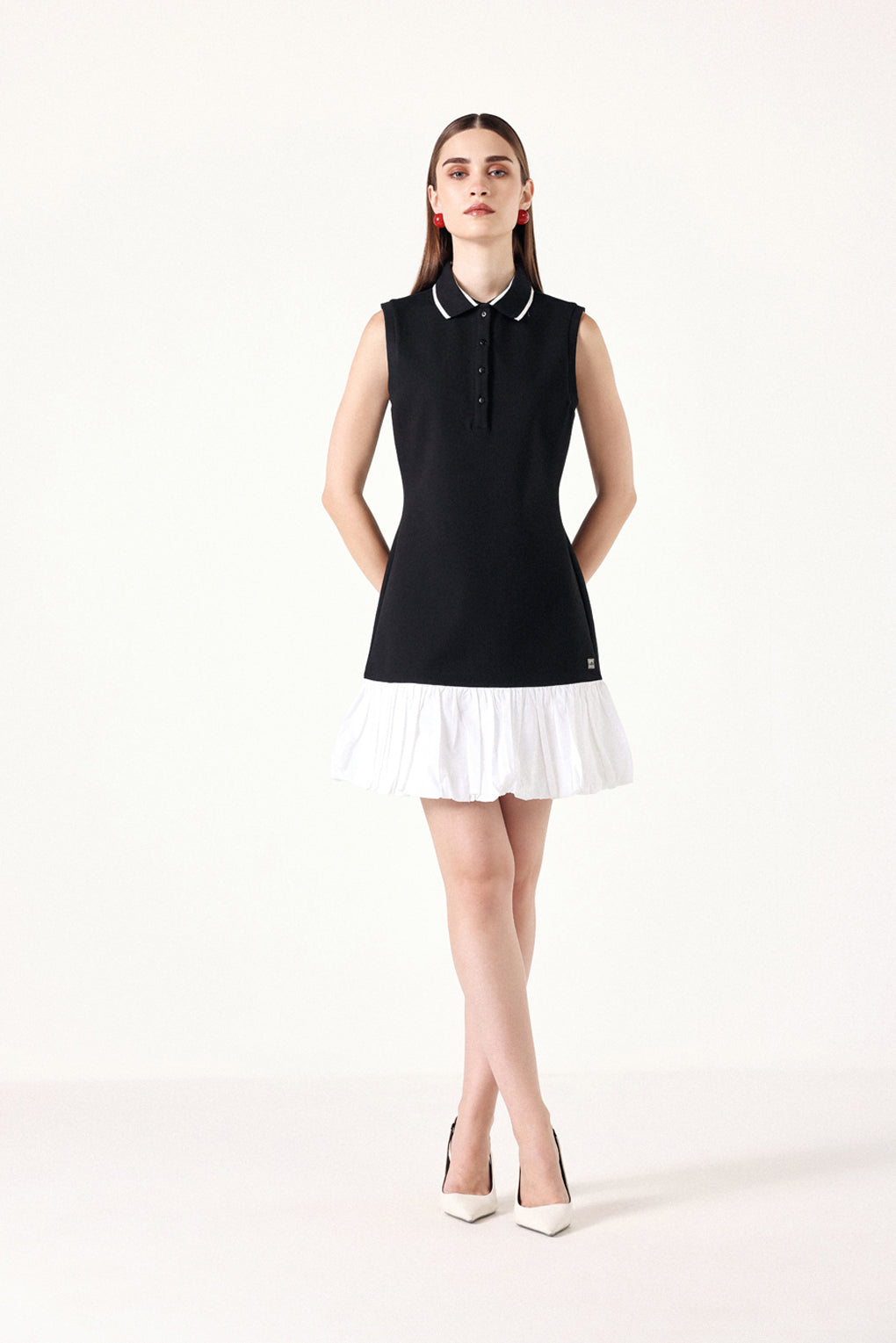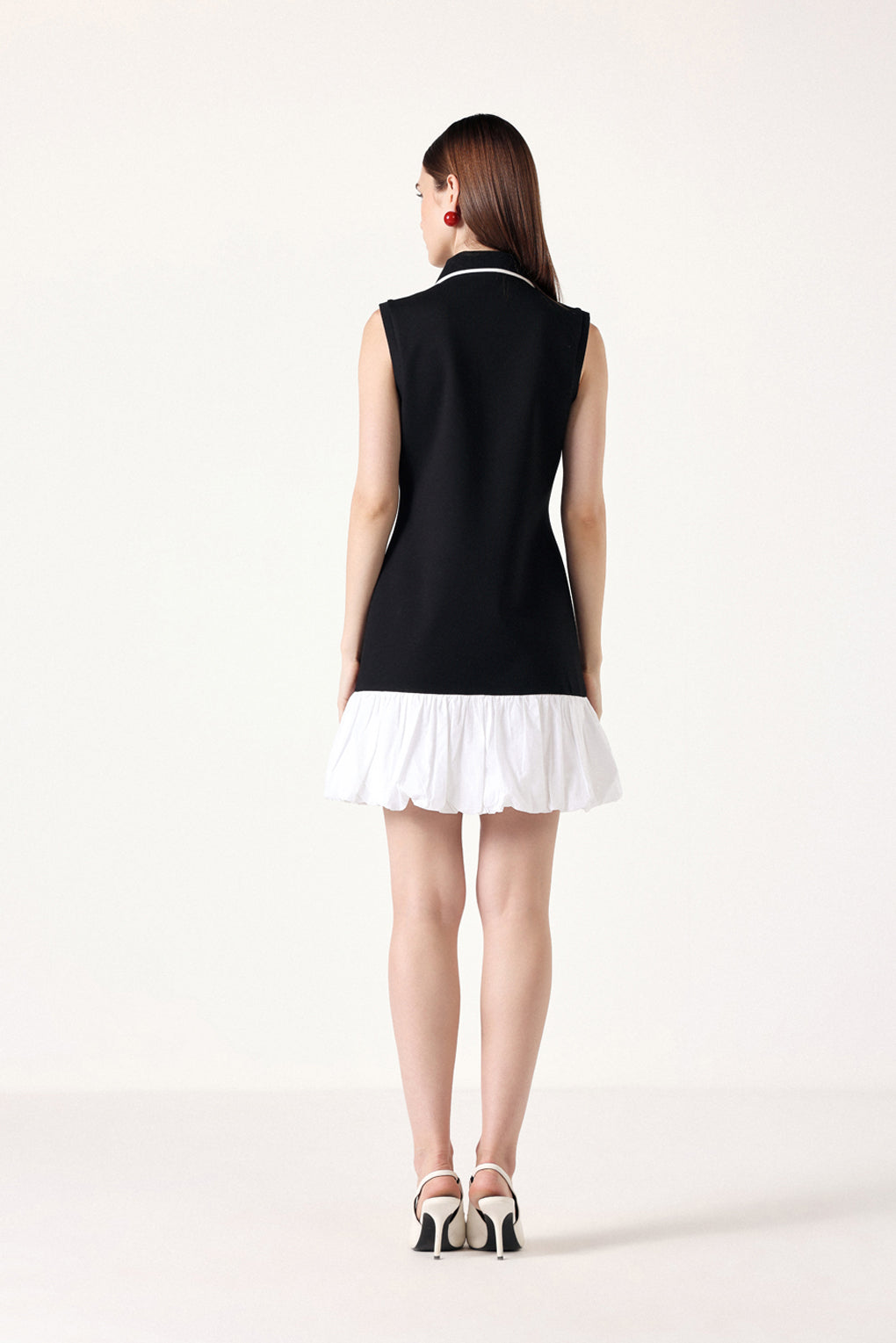 Step into effortless sophistication with our Sleeveless Contrast-Collar Tennis Dress, where sporty charm meets feminine flair. Featuring a sleek black sleeveless bodice with a refined buttoned placket and a crisp white trim collar, this dress reimagines the classic polo with a fashion-forward twist. The playful white bubble hem adds volume and a touch of drama, making it perfect for both daytime chic and evening elegance.