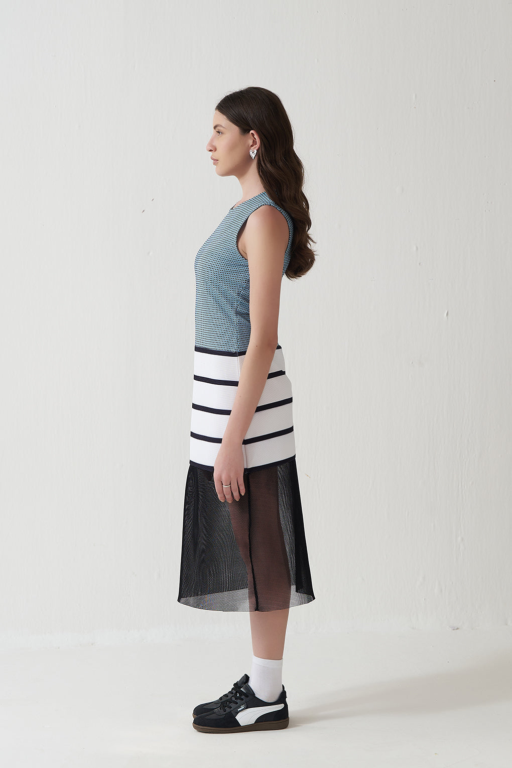 This sleeveless knit dress for women features a textured blue upper bodice paired with a contrasting white skirt detailed with horizontal navy stripes. Designed in a straight silhouette with a clean round neckline, it offers a structured yet comfortable fit. The subtle nautical-inspired colour palette adds timeless appeal, making it a versatile summer dress ideal for casual outings, vacation wear, and smart day styling.