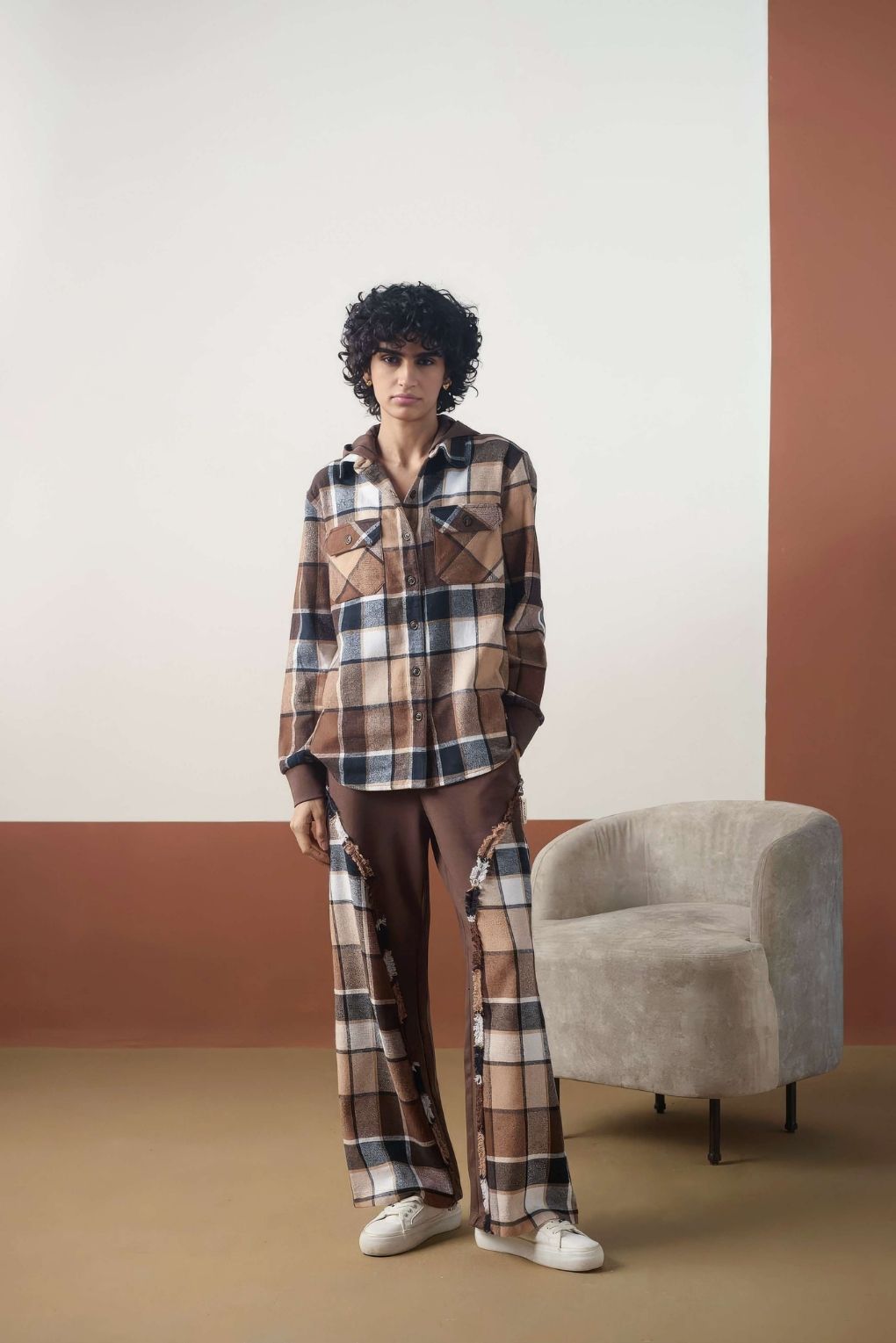 A cozy twist on a classic — this woven brushed check shirt features a soft interlock hood for added warmth and style. Designed with a relaxed fit, front patch pockets, and a button-down front, it blends laid-back comfort with a cool, layered look.