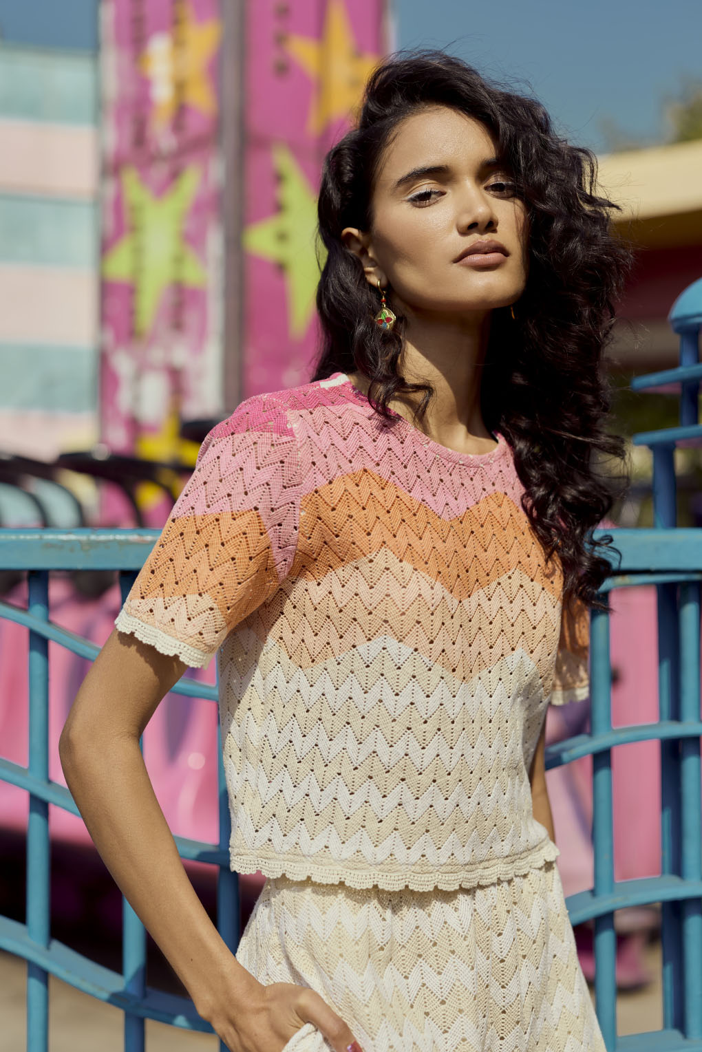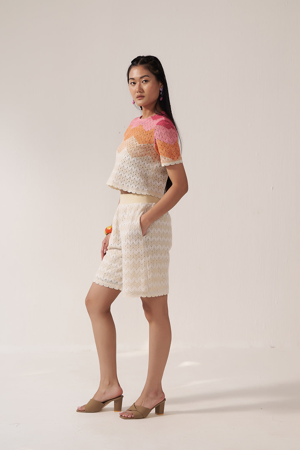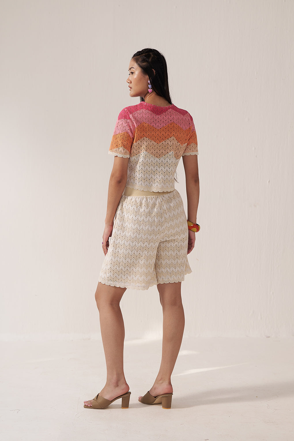 This women’s lace co-ord set features a vibrant ombré zigzag cropped top paired with neutral beige A-line shorts. The intricate lace detailing and gradient hues create a statement upper, while the high-waisted tailored shorts offer balance and structure. Designed as a stylish summer two-piece set, this ensemble is ideal for brunches, daytime events, festive gatherings, and warm-weather outings.