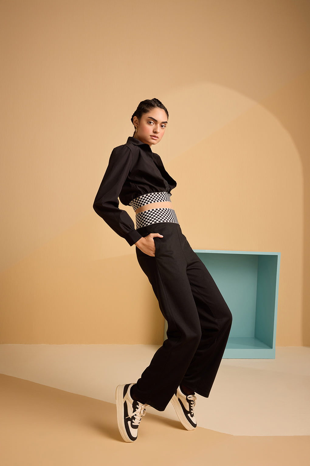 Embrace an effortless innovative dual shirt-style top, Combining the classic elements of a shirt with a tank inside with checkered elastic detail. The elastic band ensures a snug and flattering fit at the waist, creating a subtle blouson effect that accentuates your silhouette and adds visual interest to the top. Turn the eyes on you raising the style quotient with this exclusive shirt.