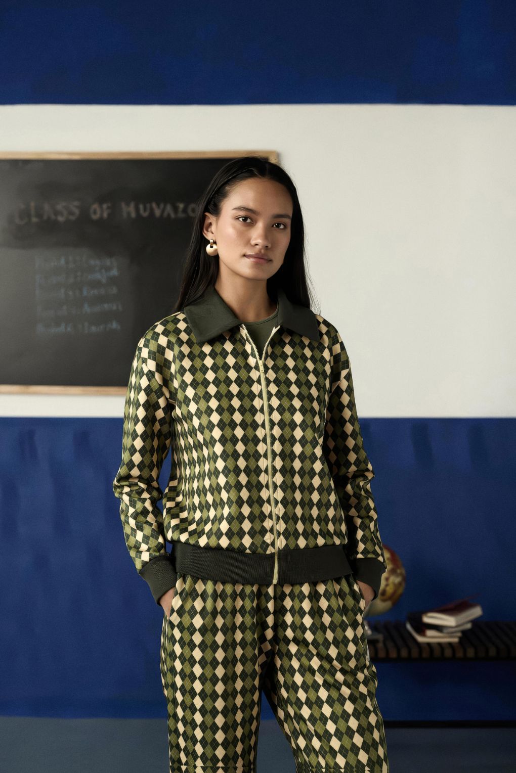 Turn heads with this statement zip-up jacket, crafted from premium scuba fabric for a sleek, structured silhouette. Designed for the modern woman, this jacket features an eye-catching harlequin-inspired diamond print in rich shades of mustard yellow, green, and olive — perfect for elevating any casual or semi-formal outfit.