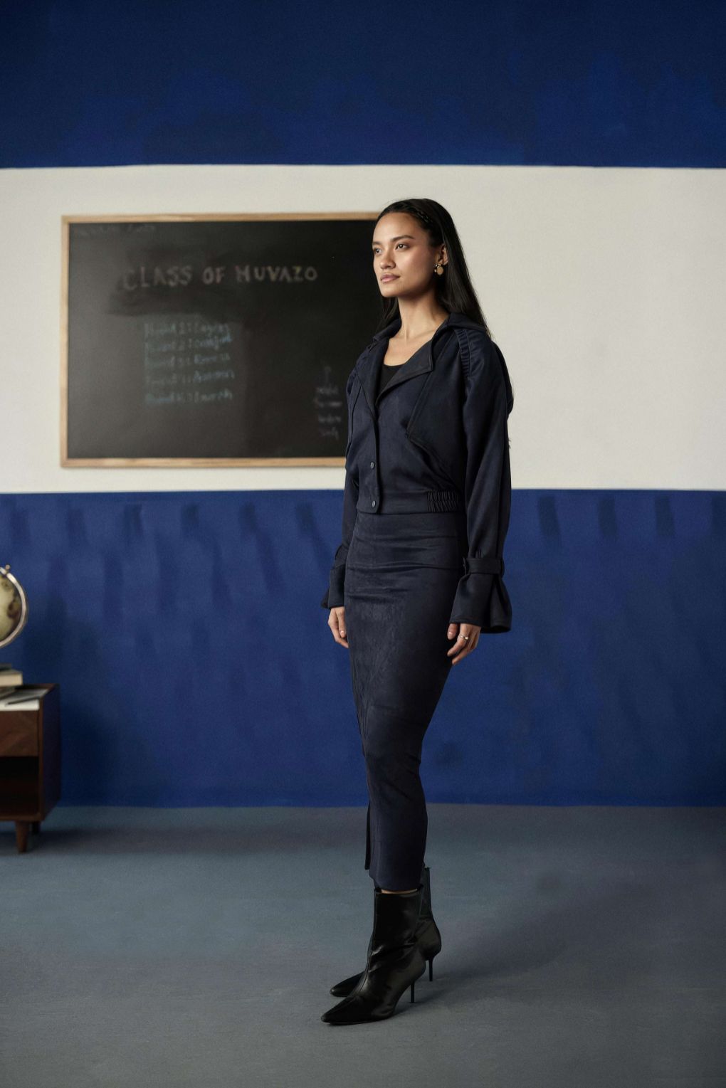 Redefine elegance with this women’s co-ord set, crafted in luxurious suede fabric for a soft yet structured appeal. The lapel-overlap jacket features flared tie sleeves, snap front details, and a gathered back with a grip hem, creating a sculpted, feminine shape. Paired with a pencil skirt featuring a side twisted detail and comfort elasticated waistband, the set blends sophistication with contemporary edge. Perfect for evening occasions, festive gatherings, or polished winter outings, it’s a standout look for the modern woman.