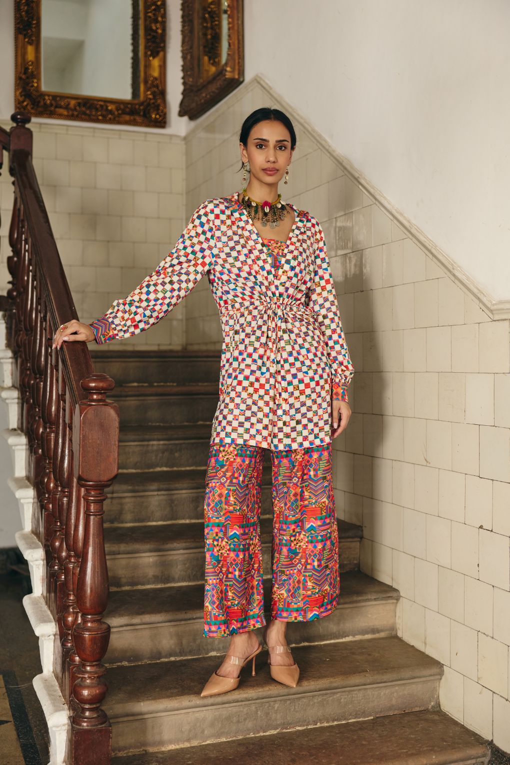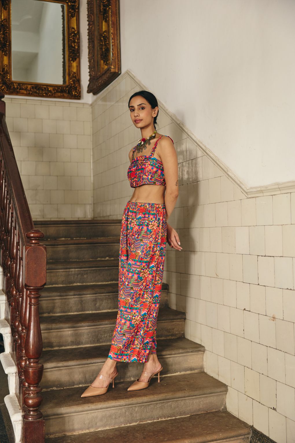 Crafted in luxurious dobby fabric, these women’s straight-fit pants feature a bold abstract maze print that adds a modern, artistic edge. The comfort-fit elasticated waistband ensures ease of wear while maintaining a sleek silhouette. Perfect for festive occasions, these pants pair effortlessly with solid tops or matching printed pieces for a statement-making look.