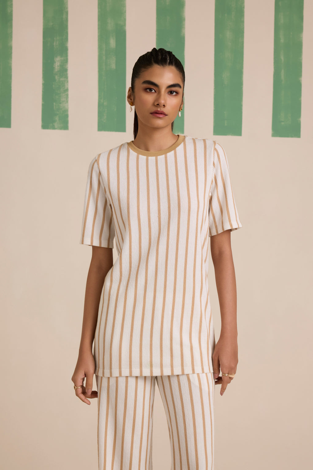 Elevate your casual chic wardrobe with this statement long top, designed for a modern and relaxed vibe! Redefine effortless style with this regular-fit long top, crafted in premium jacquard stripe fabric for a touch of texture and sophistication. Designed with a contrast rib detail on the neck, it adds a sporty yet refined edge to your casual wardrobe. Whether paired with jeans, shorts, or layered under a jacket, this versatile staple is ideal for everyday wear and travel-friendly styling.