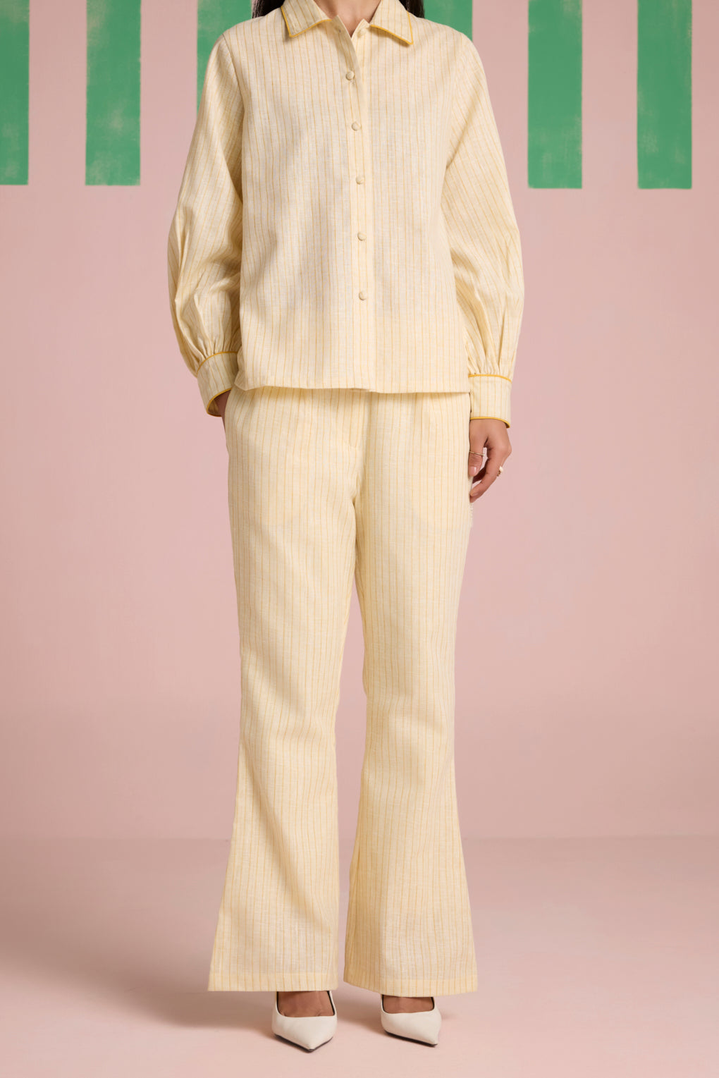 Effortlessly chic and tailored to perfection, these linen stripe boot-cut pants are designed for a flattering and elongated silhouette. The contrast piping detail on the waistband adds a refined touch, enhancing the classic design with a modern twist. Crafted from lightweight and breathable linen, these pants offer both comfort and sophistication, making them a versatile addition to your wardrobe.