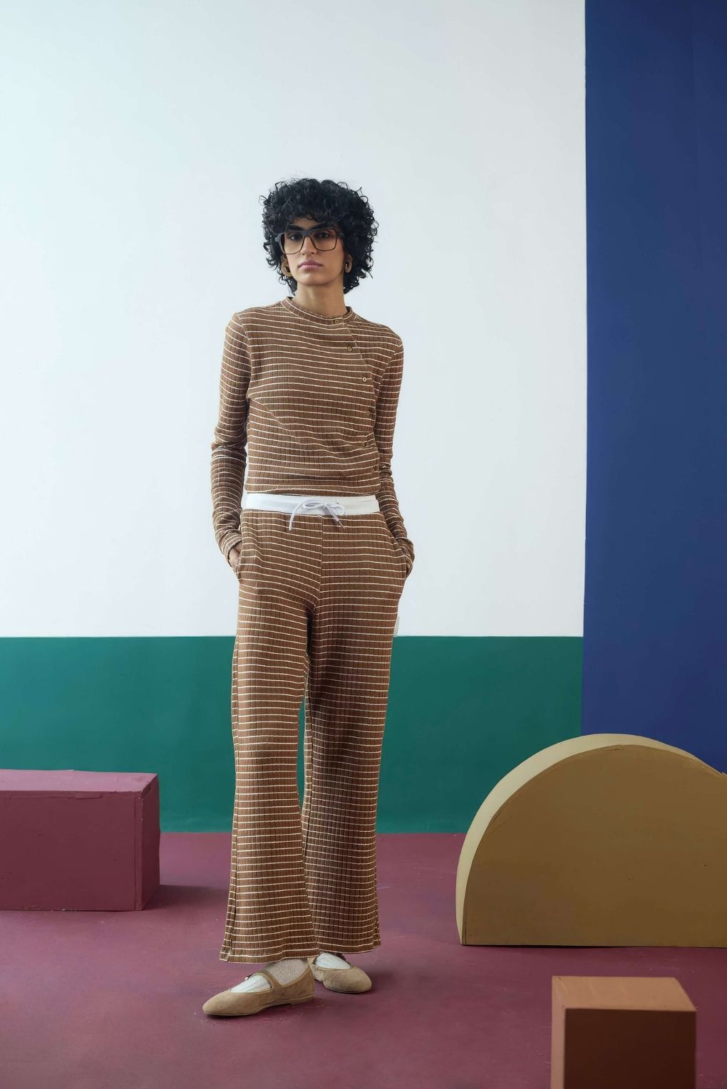 Crafted in a cozy jacquard waffle-knit fabric, this striped co-ord set pairs comfort with a refined look. The fitted top offers a snug, flattering silhouette with soft stretch and a textured finish. The relaxed-fit pants add ease to the outfit, giving you room to style the set in multiple ways.