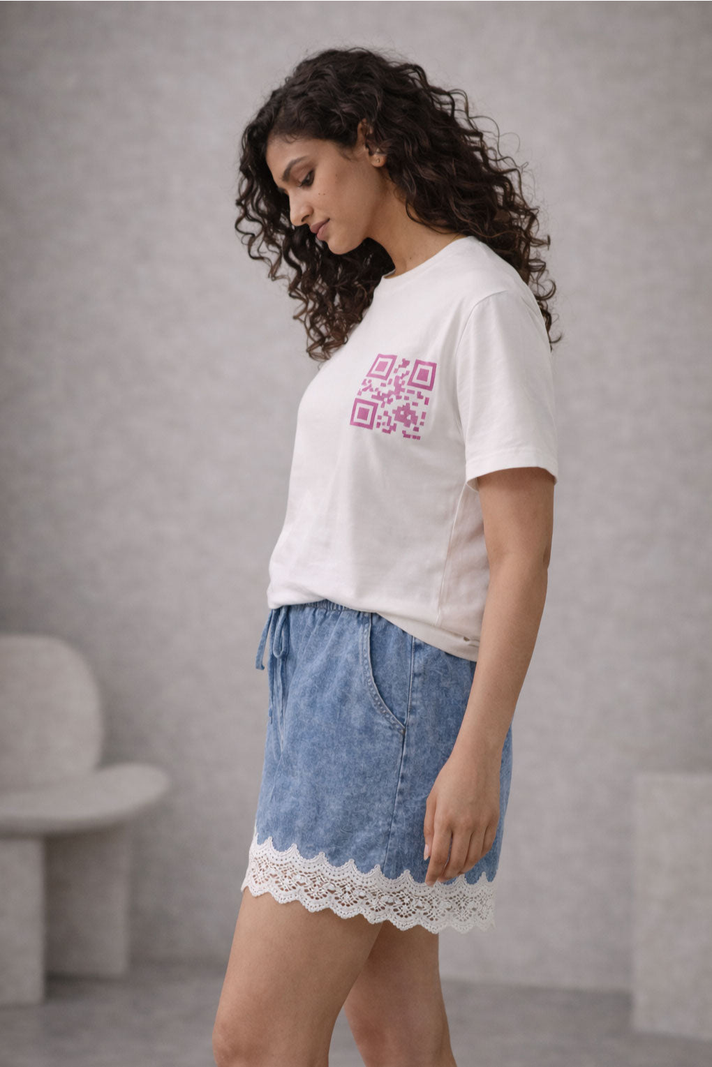 Elevate your bedtime style with the "Love Barcode She Tee" Crafted in a soft cotton spandex jersey fabric, & cordinate with Moonlace Lounge Shorts Made from an ultra-soft cotton poly denim washed fabric in a lovely shade of blue. this t-shirt offers ultimate comfort for lounging or sleeping. The hem is highlighted with delicate moon lace detailing, adding a touch of feminine charm. While perfect as night shorts, their casual charm means they can easily be worn during the day time with an chifley shirt, spaghetti top, or graphic tee for effortless casual vibes.