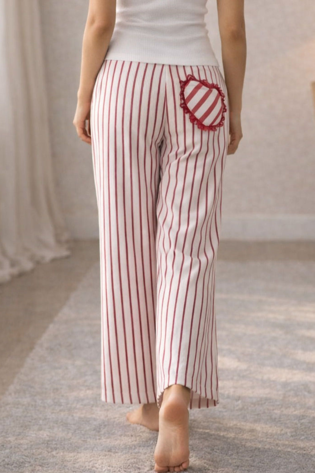 Crafted from 100% cotton twill, these full-length straight pants are designed for a relaxed, effortless fit. The all-over stripe print adds a fresh, modern touch, while the back heart-shaped pocket adorned with contrast lace detailing brings a playful, cute accent.