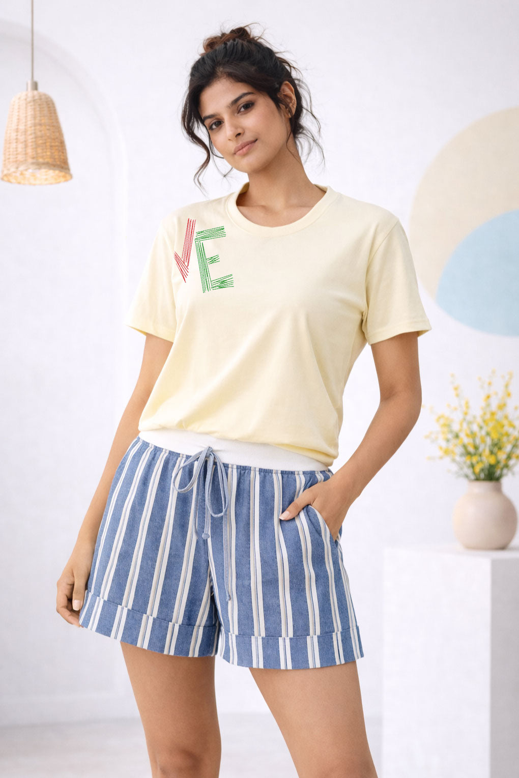 Paired with Dreamline striped lounge shorts, made from washed cotton-poly woven denim, the set brings a stylish yet cozy appeal. The striped pattern in denim blue and yellow adds a fresh, cheerful touch, while the breathable fabric ensures ease of movement and all-day comfort.