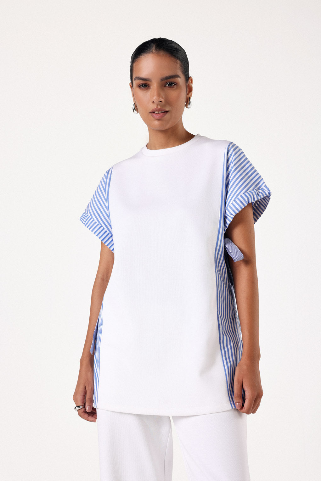 Introducing our crew neck top, featuring extended shoulders and striking stripe color-block details. The striped strap tie-up adds a stylish accent, while side slits offer a relaxed, flowy fit. Designed in a classic combination of blue and white, this top is perfect for everyday wear or casual gatherings.