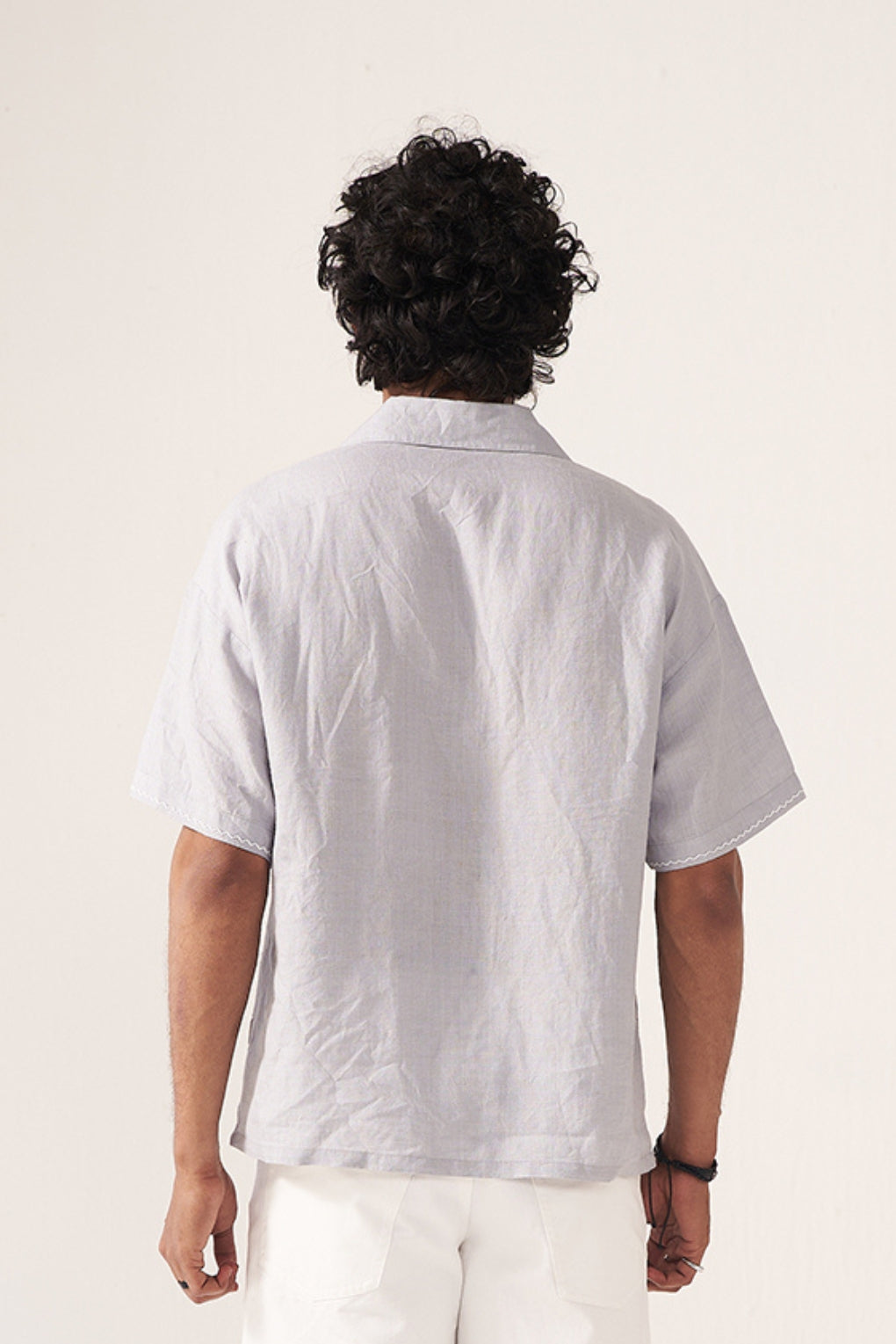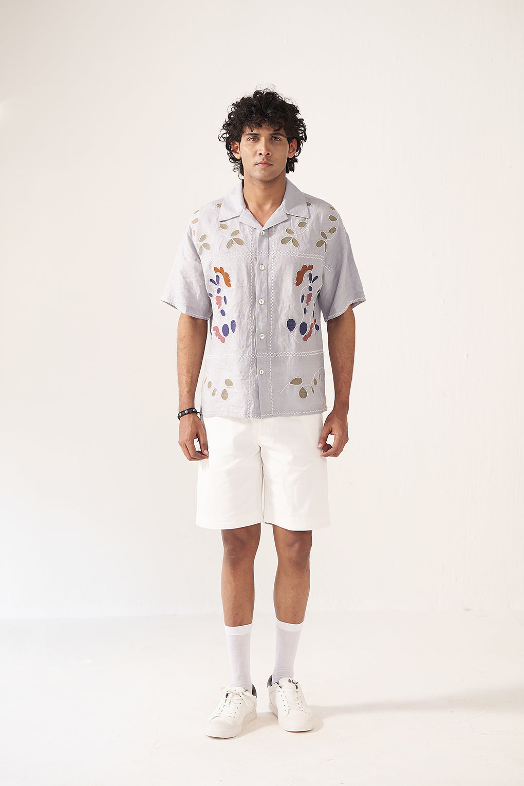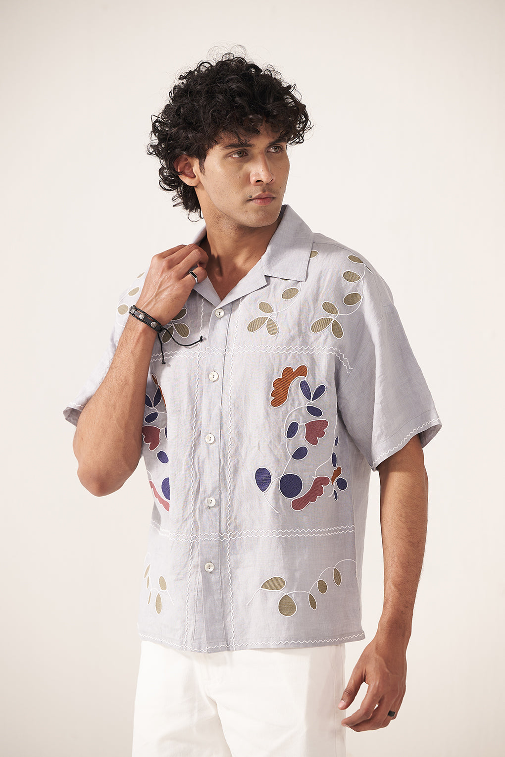 A relaxed-fit button-down shirt crafted in a soft, breathable fabric featuring delicate multicolor embroidery inspired by nature. Designed with a notched collar and short sleeves, this piece blends playful artistry with effortless comfort—perfect for vacation styling or elevated everyday wear.
