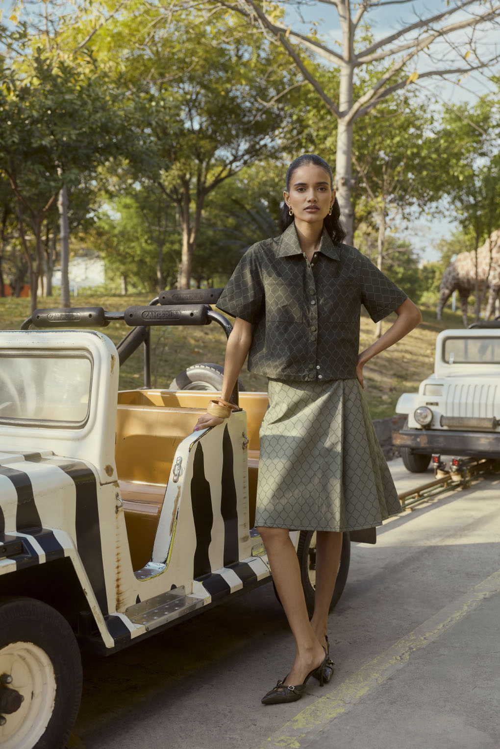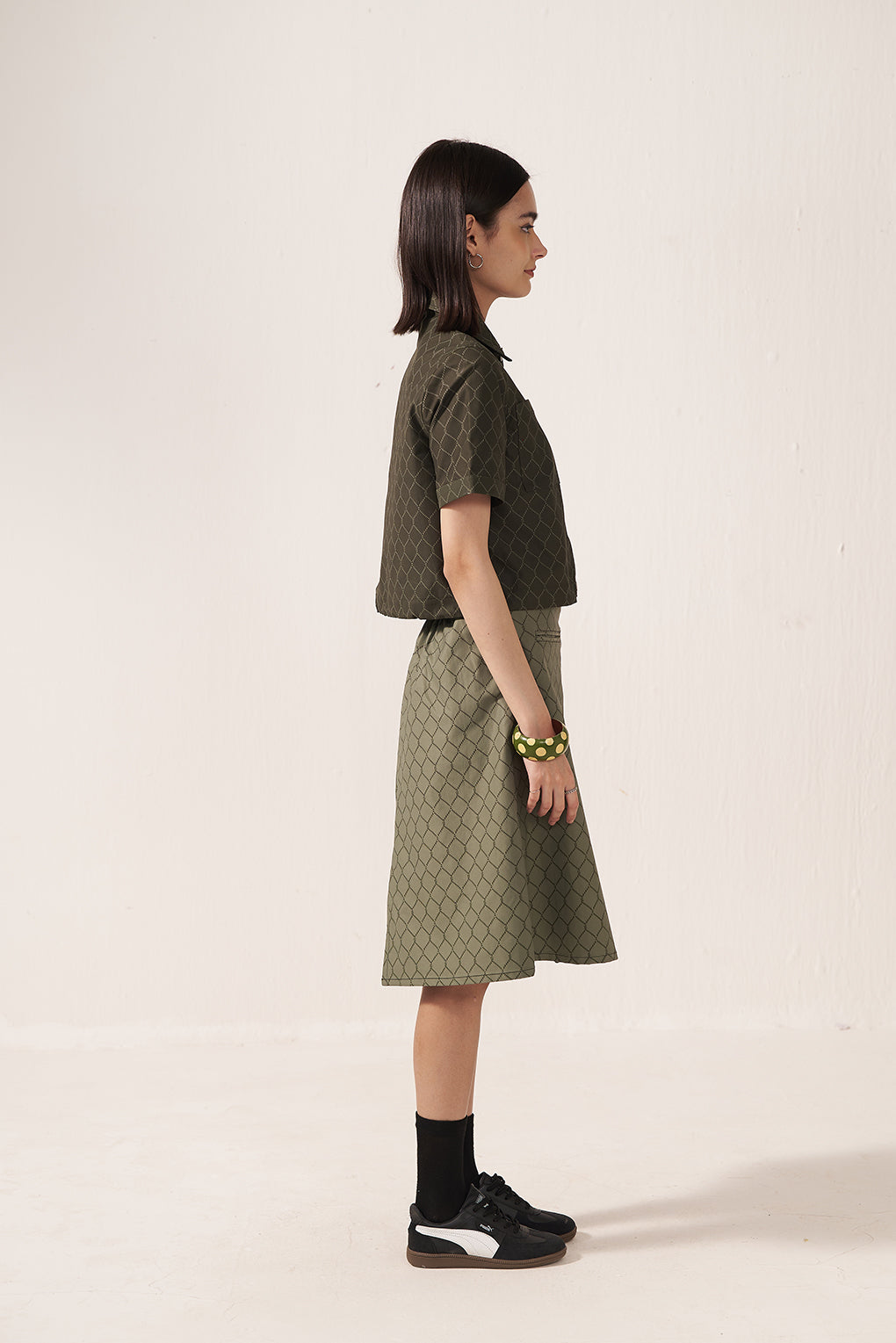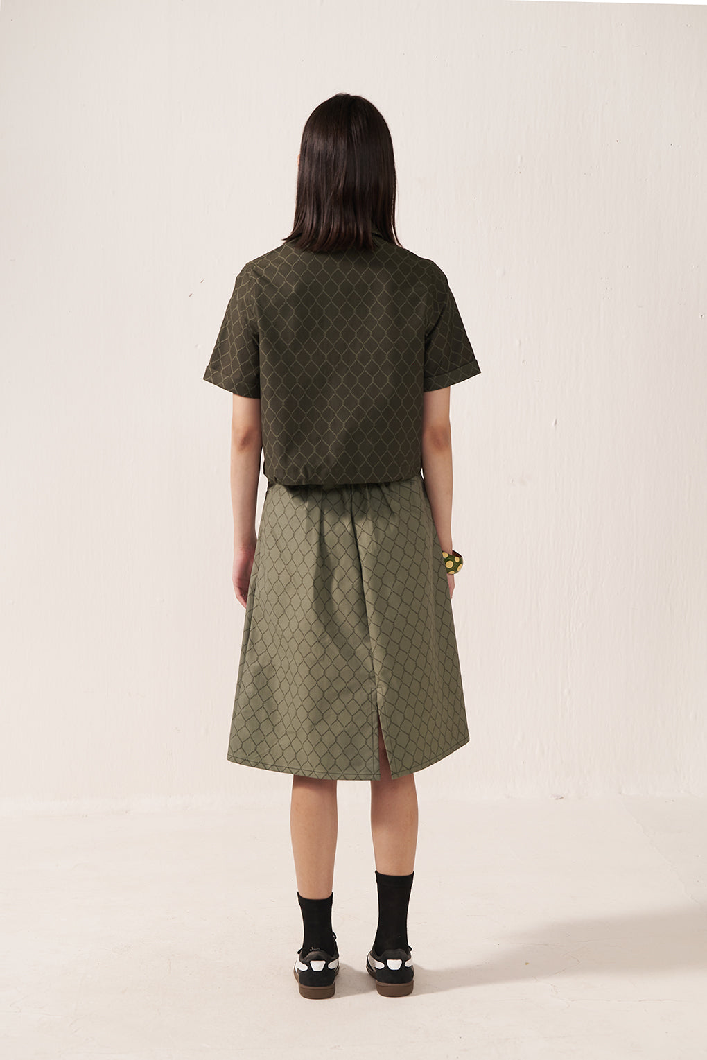 Together, the top and skirt form a coordinated set in a matching olive-green geometric print. The tailored shirt balances the flared silhouette of the midi skirt, creating a cohesive and well-structured outfit. The coordinated design gives a refined and sophisticated look, ideal for smart casual or semi-formal occasions.