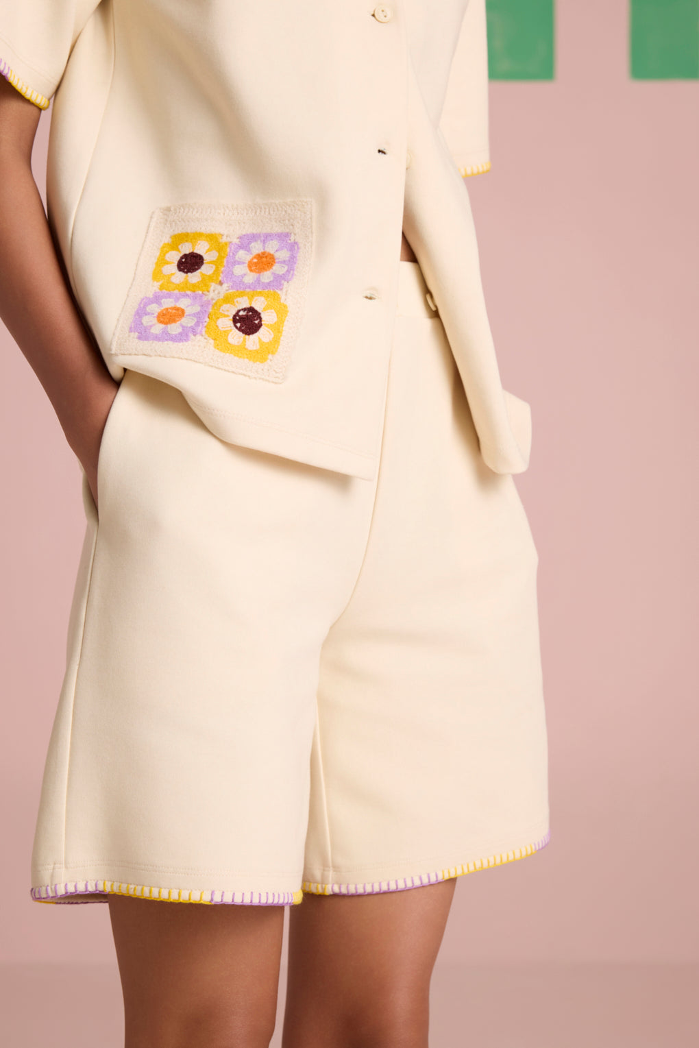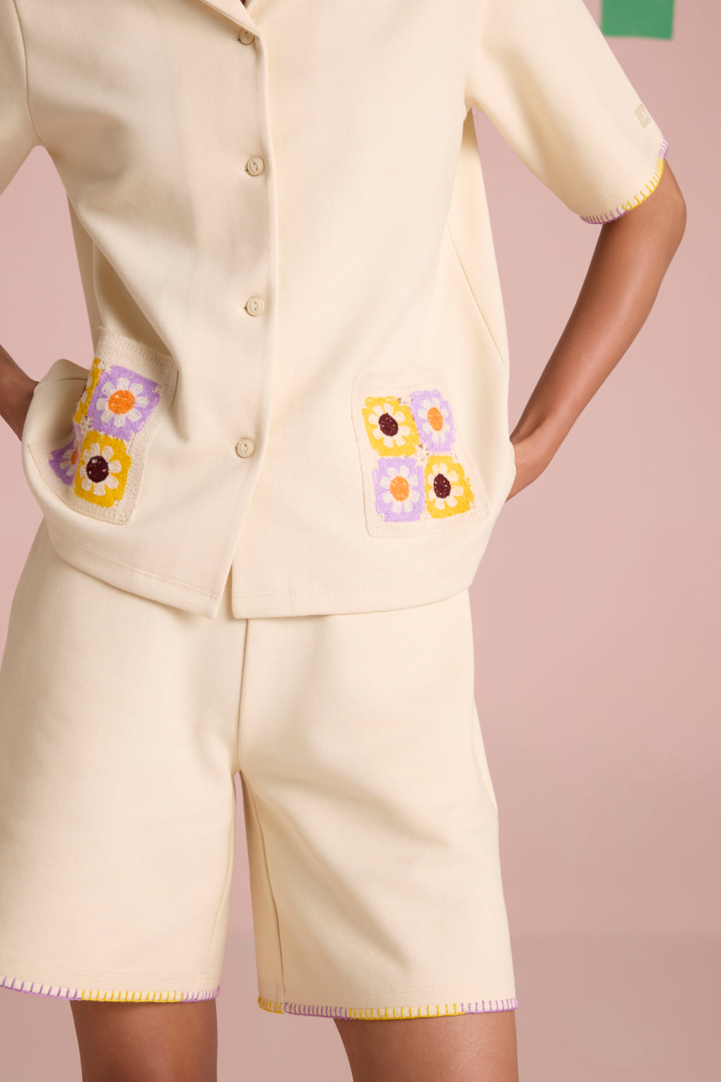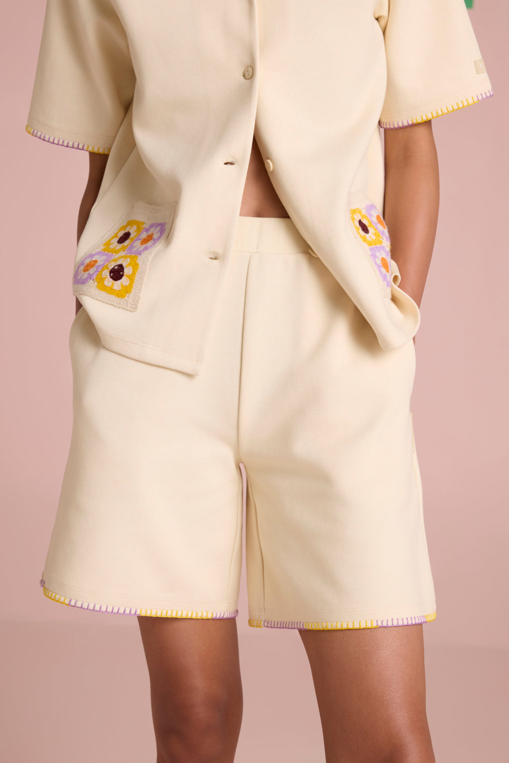 Effortlessly stylish and breezy, this summer-friendly co-ord set is designed for comfort with a touch of artisanal charm. The boxy fit shirt, crafted from lightweight, breathable fabric, features a front button closure for versatile styling. The contrast dual-color blanket stitch on the collar adds a handcrafted appeal, while the crochet patch pockets elevate the look with delicate texture. Paired with relaxed-fit shorts, designed with a comfortable elasticated rib waistband for ease of movement, the set is finished with matching contrast dual-color blanket stitch detailing on the hem, bringing a cohesive, stylish edge.