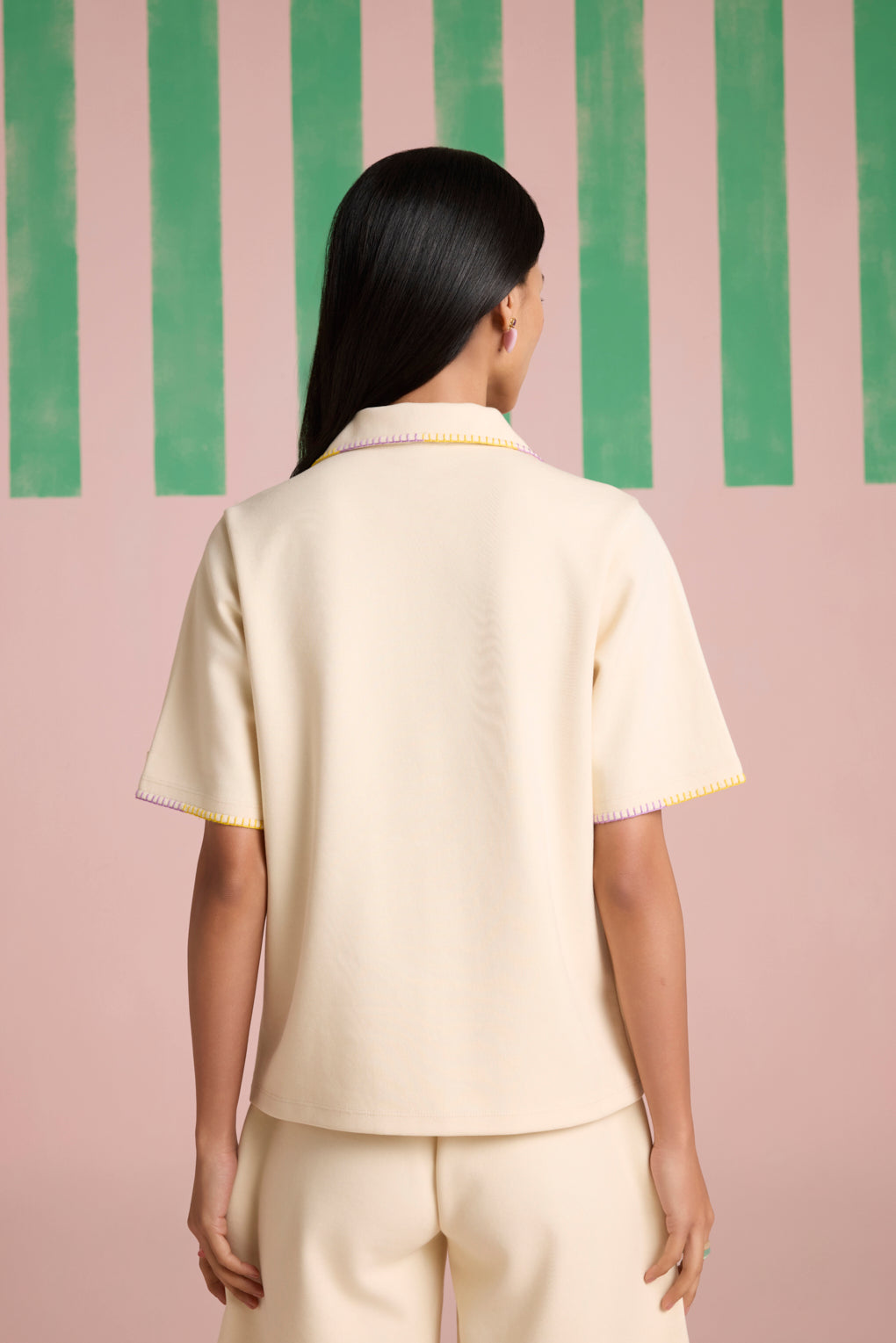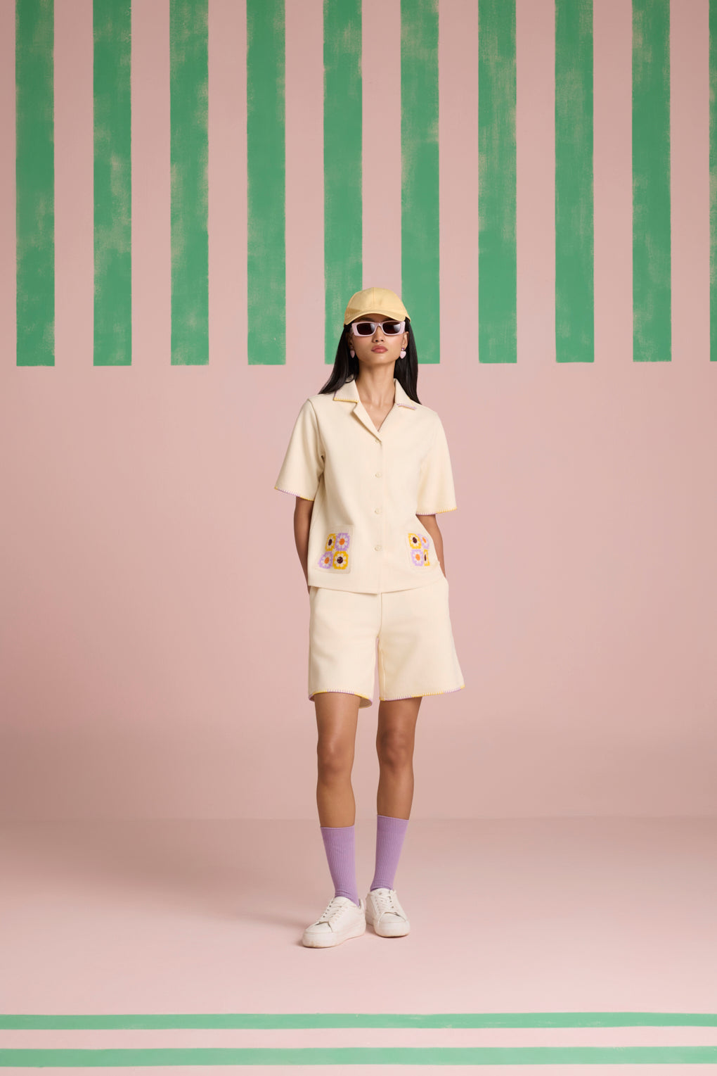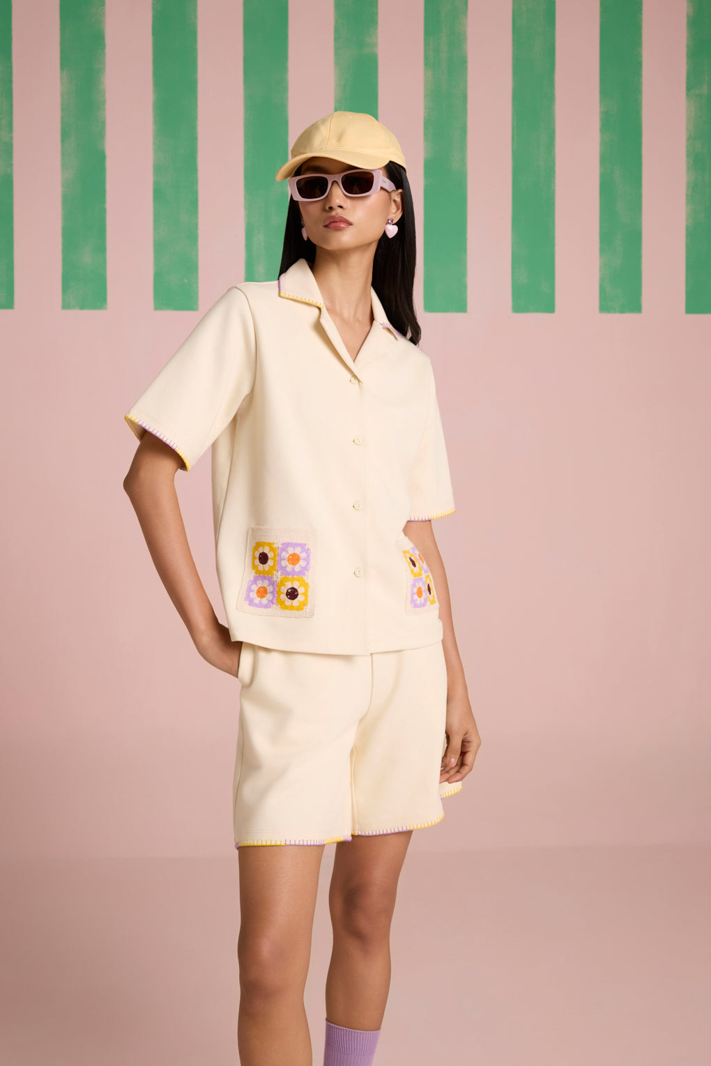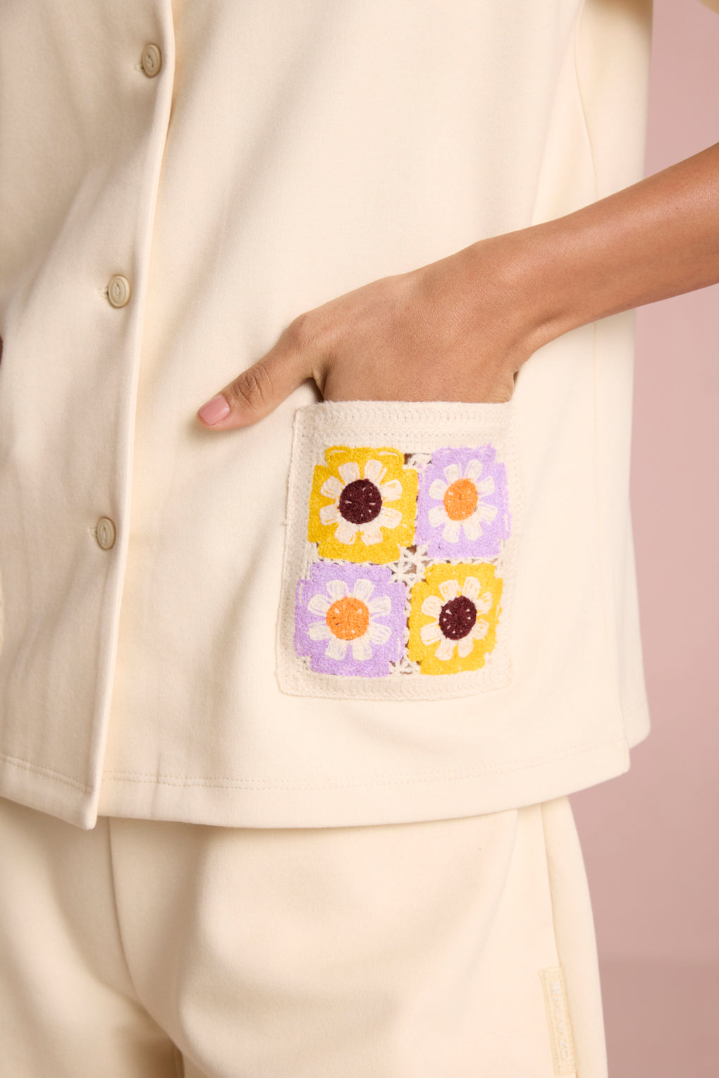 Effortlessly stylish and breezy, this summer-friendly co-ord set is designed for comfort with a touch of artisanal charm. The boxy fit shirt, crafted from lightweight, breathable fabric, features a front button closure for versatile styling. The contrast dual-color blanket stitch on the collar adds a handcrafted appeal, while the crochet patch pockets elevate the look with delicate texture. Paired with relaxed-fit shorts, designed with a comfortable elasticated rib waistband for ease of movement, the set is finished with matching contrast dual-color blanket stitch detailing on the hem, bringing a cohesive, stylish edge.