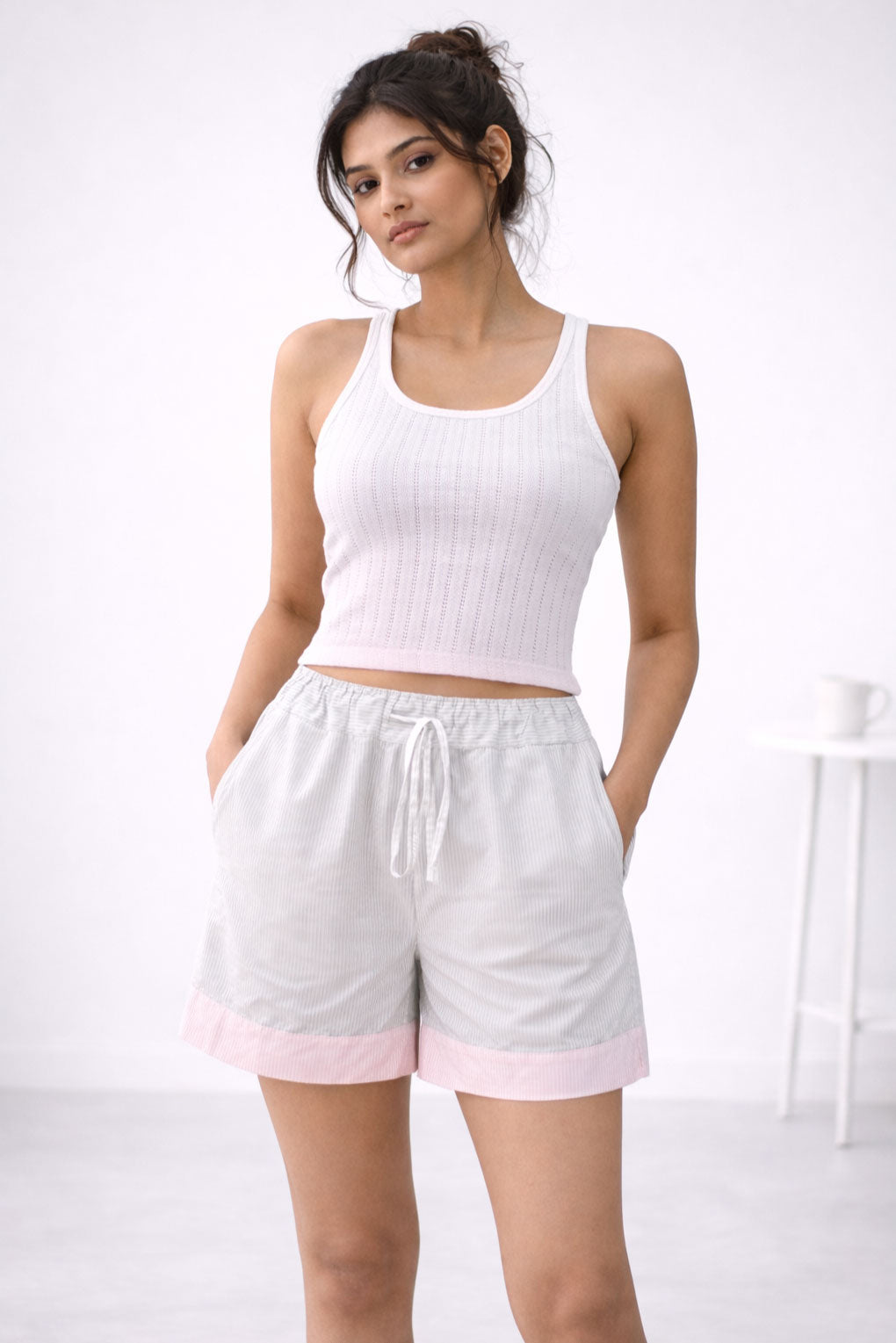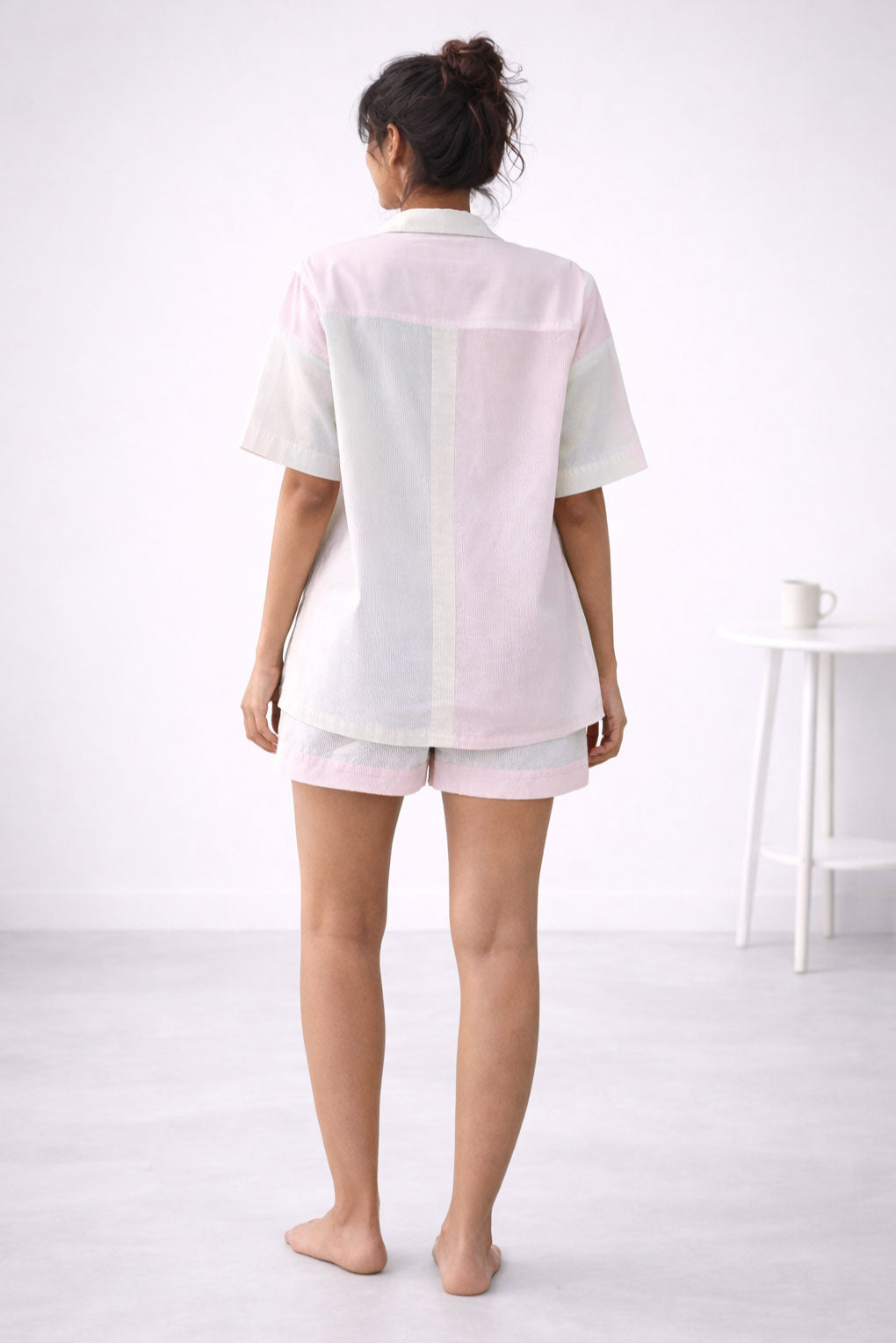 Designed for effortless lounging with a modern edge, this unisex co-ord set blends premium comfort with relaxed, contemporary style. The 100% cotton twill printed stripe shirt features multi-colour panel detailing, offering a refined yet playful look. Lightweight and breathable, it can be worn as a tunic or styled open over inner layers for an easy, laid-back vibe.