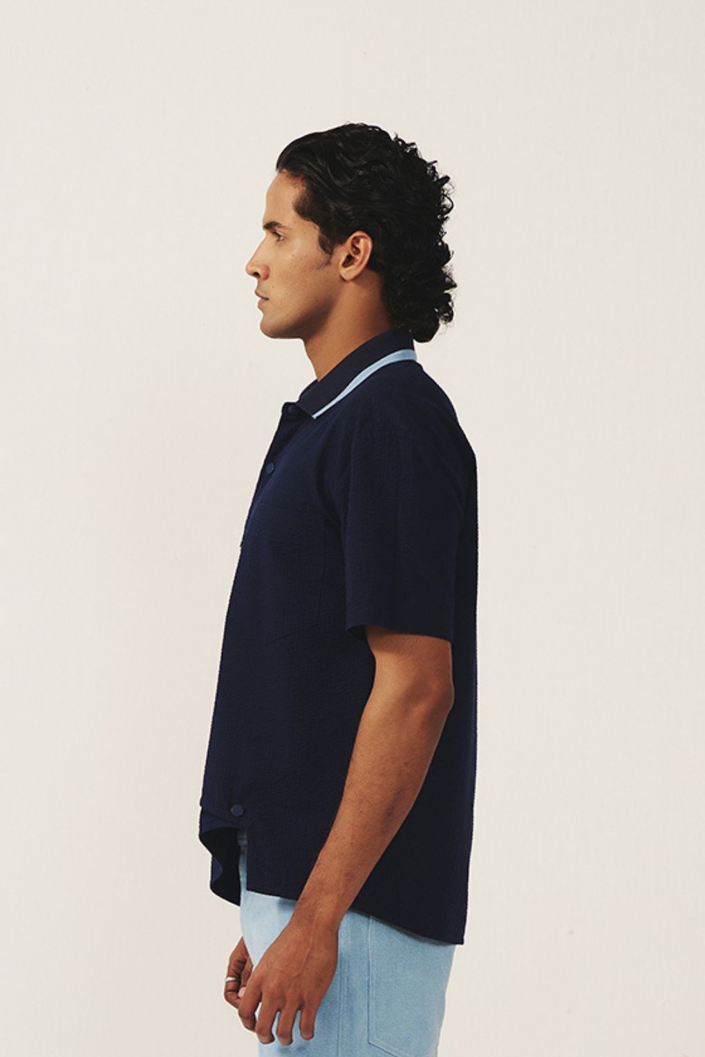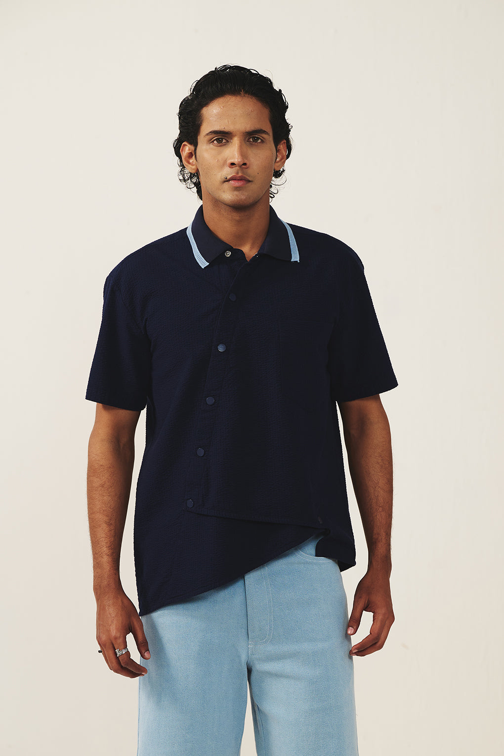 A modern reinterpretation of a classic essential, this navy polo shirt stands out with its asymmetrical layered hem detail. Crafted from soft, breathable fabric, it ensures all-day comfort while delivering a sharp, contemporary silhouette. The classic collar and button placket retain timeless appeal, while the unexpected front overlay adds depth and design interest. Perfect for elevating everyday dressing, this piece pairs effortlessly with tailored trousers, denim, or relaxed bottoms for a smart yet creative look.