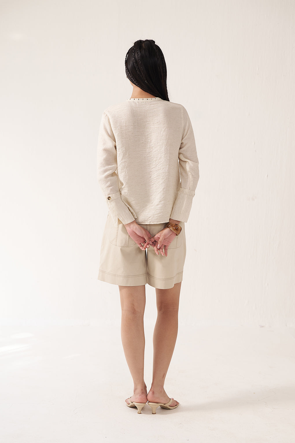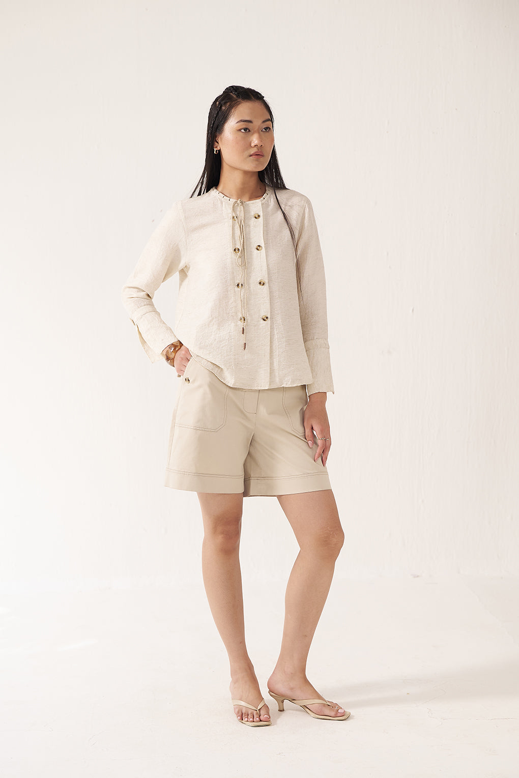 The structured beige shorts and textured lace-up top create a cohesive neutral coordinate with a refined utilitarian appeal. The matching tones and complementary button details unify the look, balancing sharp structure with relaxed movement for a modern, semi-casual ensemble.