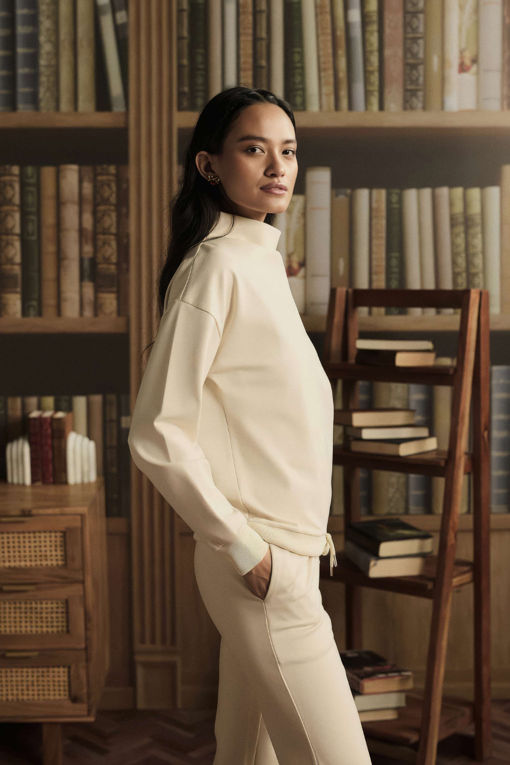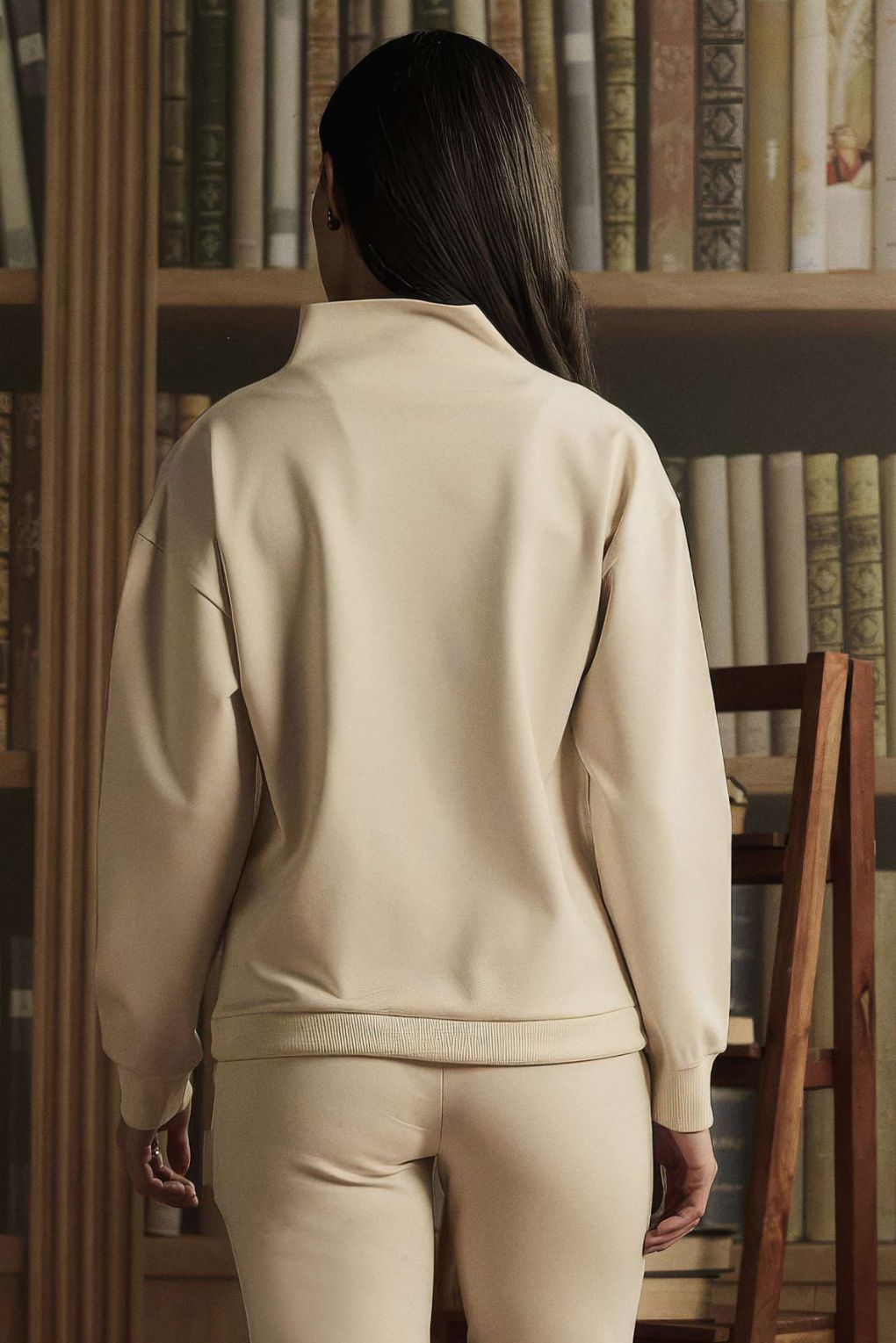 Stay effortlessly stylish on chilly days with this women’s sweatshirt, crafted in luxurious premium ponte fabric for a soft yet structured feel. Designed with a smart high neck featuring a cowl detail, it offers both warmth and sophistication. The ribbed bottom hem with an adjustable cord allows for a customizable fit, making it as functional as it is fashionable. Perfect for cozy days or polished casual outings, this sweatshirt blends comfort, versatility, and modern appeal.
