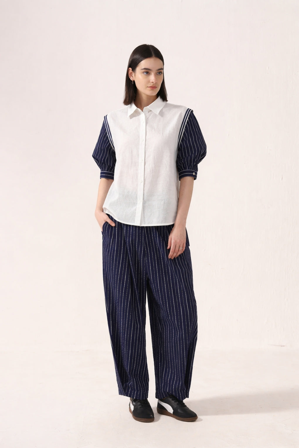 This contemporary shirt features a crisp, solid bodice with a classic pointed collar and concealed button placket for a clean, structured look. The design stands out with contrasting striped sleeves that create a layered, statement effect, adding depth and visual interest. Tailored in a lightweight fabric, it offers a relaxed yet polished silhouette with sharp finishing details at the cuffs. Blending classic shirting elements with modern contrast styling, this piece is ideal for refined workwear or elevated smart-casual dressing.