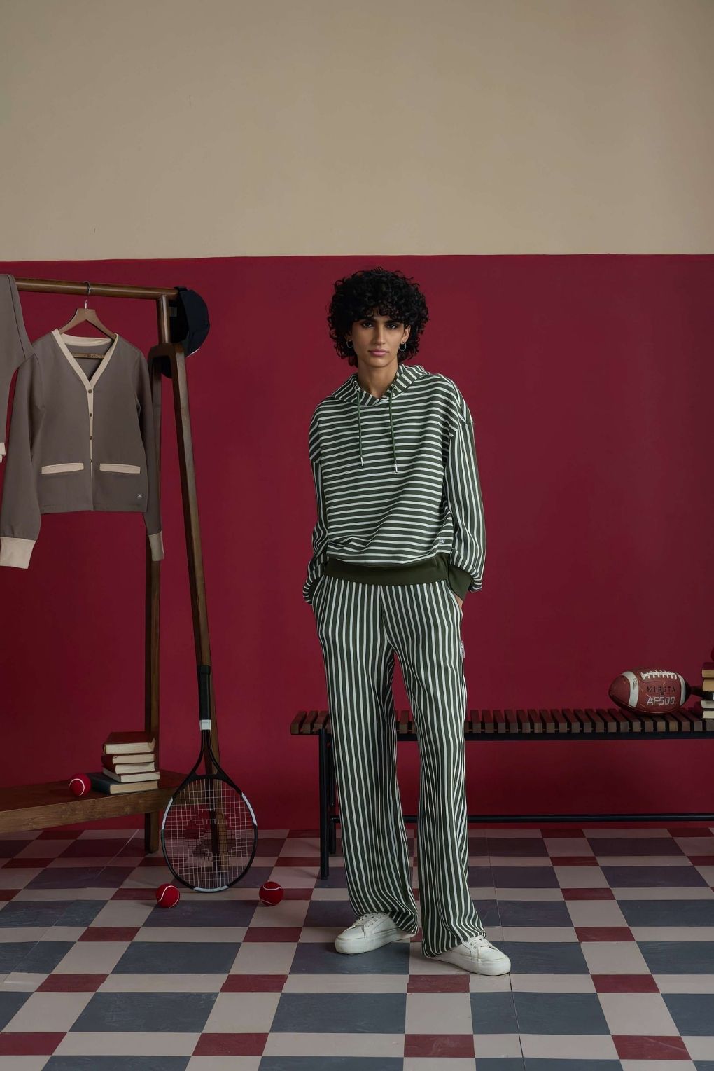 Add texture and timeless style to your everyday wardrobe with this striped hoodie, crafted from a compact waffle rib fabric that offers a structured yet cozy feel. Designed for both comfort and style, this piece features classic horizontal stripes in a olive and off-white palette, making it a versatile staple for laid-back days or casual outings.