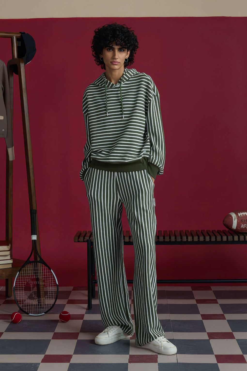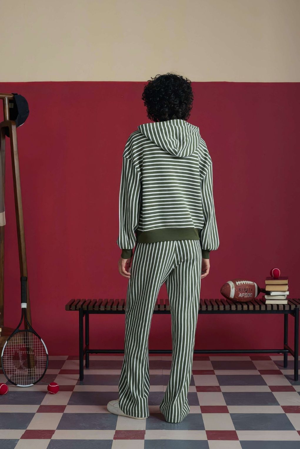 Strike the perfect balance between comfort and style with this effortlessly cool striped co-ord set, crafted in soft, compact waffle rib fabric. Featuring a relaxed-fit hoodie and matching wide-leg pants, this two-piece set delivers laid-back polish with a touch of street-style edge.