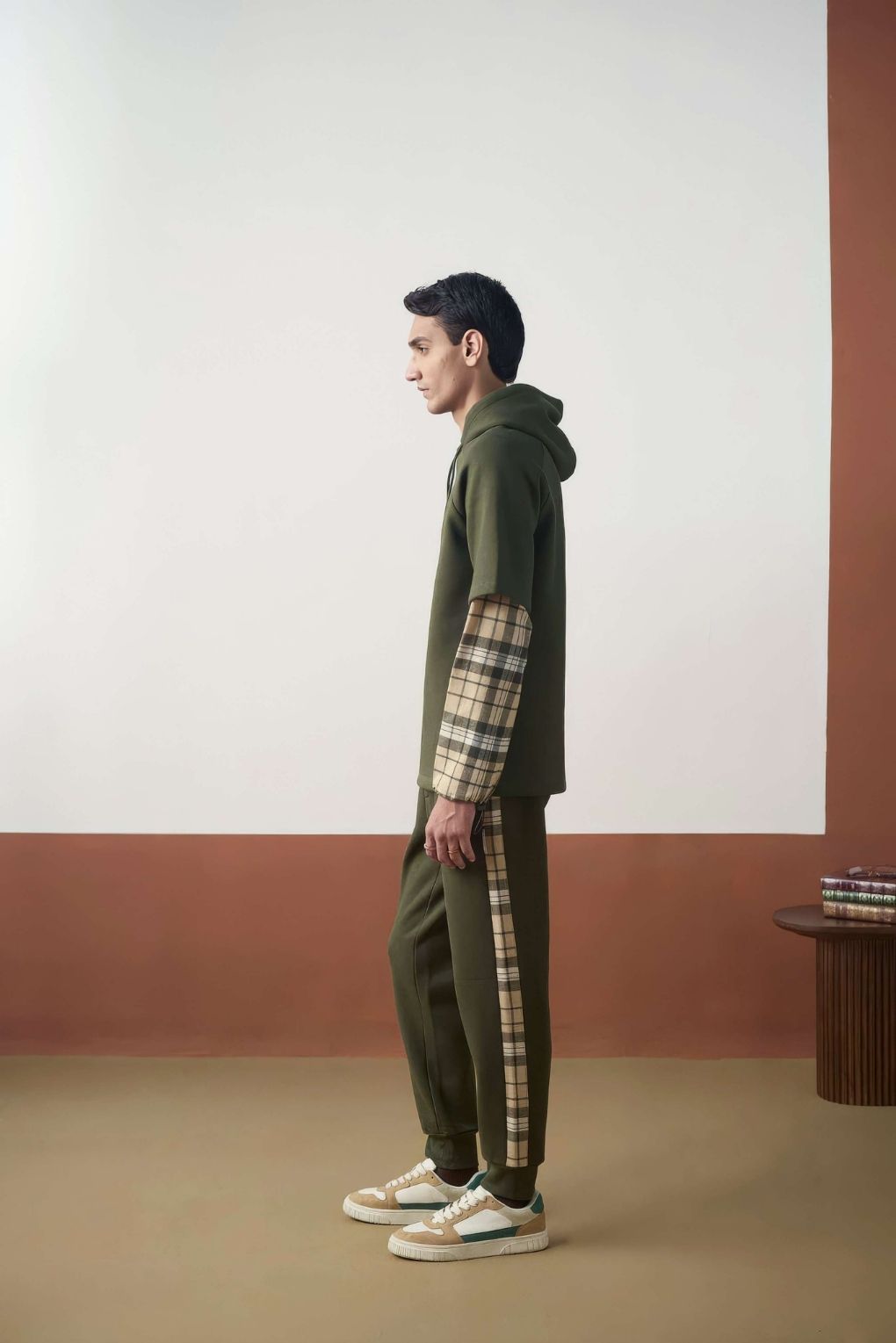 Step up your casual game with this unique olive green hoodie featuring contrasting plaid long sleeves for a bold, stylish look. The hoodie has a comfortable drawstring hood and a relaxed fit. Paired with matching olive joggers accented by the same plaid pattern on the sides, this set offers coordinated style with ultimate comfort. Made from soft, mid-weight fabric, it's perfect for laid-back days or casual outings.