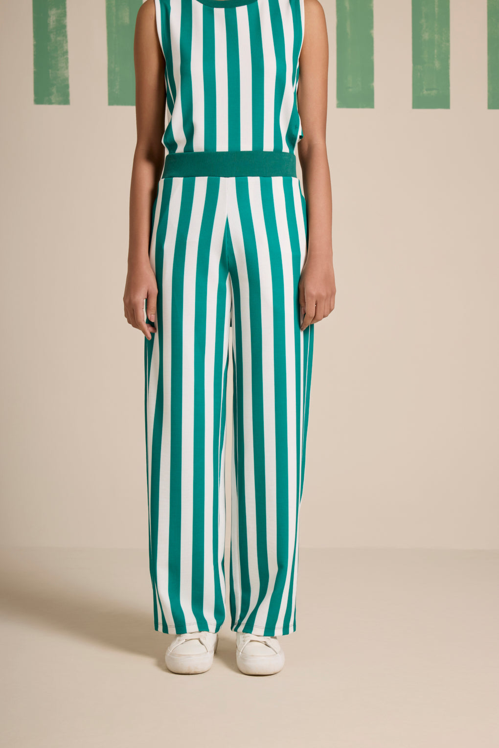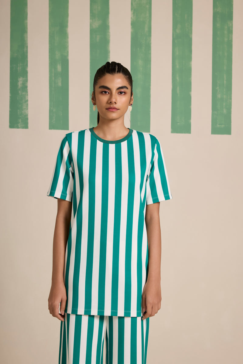 Effortless style meets ultimate comfort in this chic co-ord set, featuring a regular-fit long hip covering top and straight pants, both crafted from premium jacquard stripe fabric for a sleek, textured look. The top is designed with a contrast rib detail on the neck , adding a modern edge to its relaxed silhouette. The straight pants come with an elasticated waistband, ensuring a comfortable and flattering fit for all-day wear.