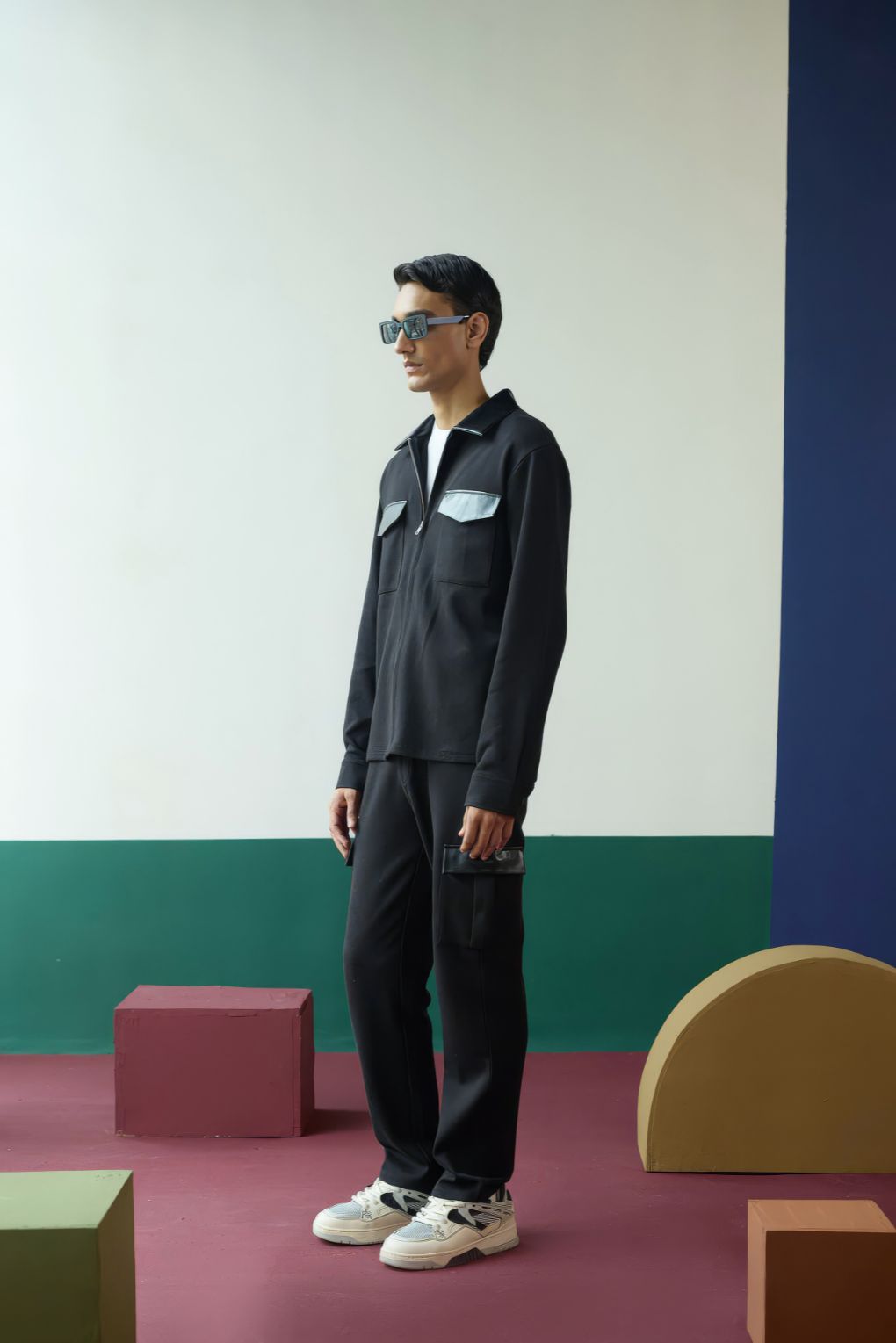 This coordinated black outfit seamlessly blends casual comfort with elevated street style. The zip-up top with contrast faux leather detailing on the collar and pockets offers a modern utilitarian edge, while the matching cargo-style pants bring functional flair with side flap pockets. Paired with clean sneakers and sunglasses, the look is effortlessly cool and versatile—ideal for a laid-back yet polished appearance.