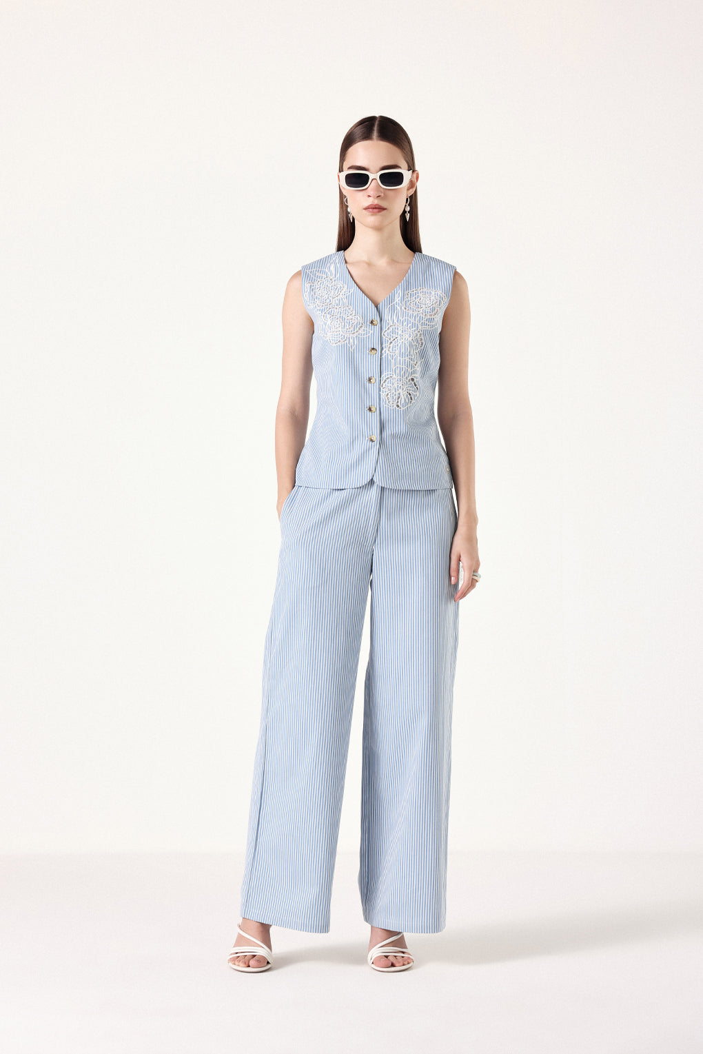 Chic, coordinated, and effortlessly stylish — this striped co-ord set blends modern tailoring with delicate feminine detail. The sleeveless vest top features romantic rose cutwork embroidery on the front, adding a soft, artisanal touch to the structured stripe design. Paired with matching wide-leg pants, the vertical stripes elongate the silhouette, offering a flattering and balanced look from top to bottom.
