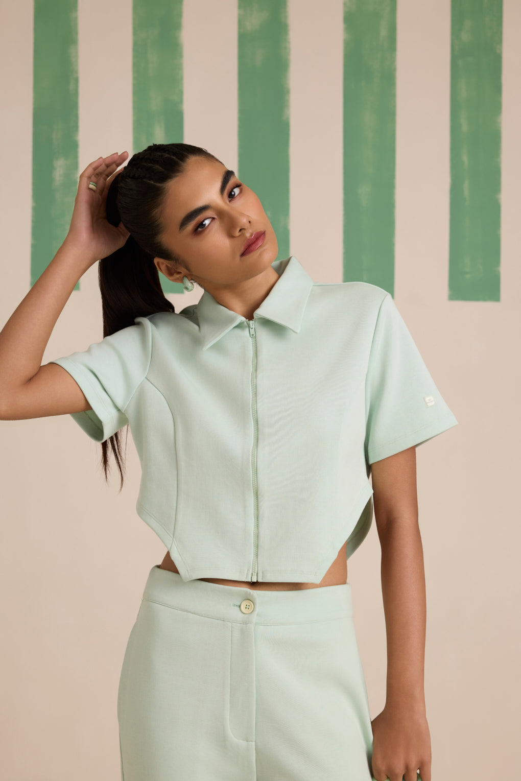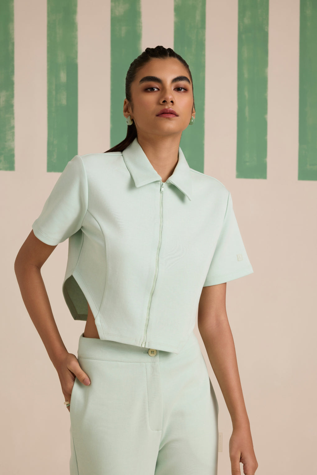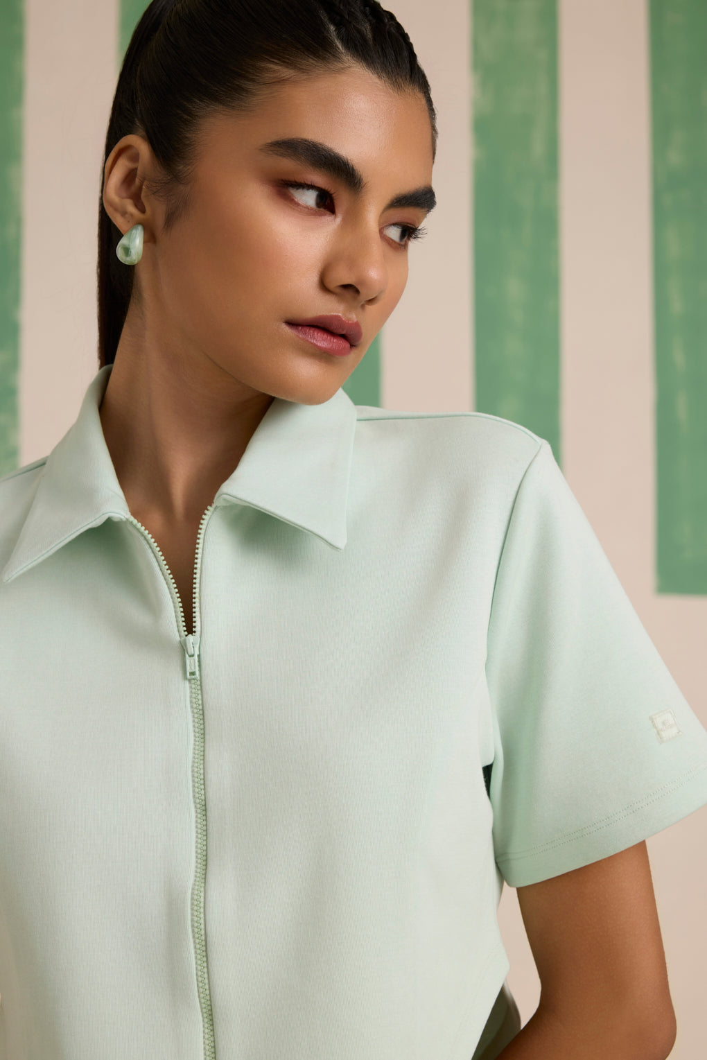 Upgrade your casual wear with this chic and breathable half-sleeve top, crafted in summer-friendly knit fabric for all-day comfort. Designed with stylish panel detailing, it features a unique U-shaped bottom cut that adds a modern touch. The collared neckline and front zipper opening bring a sporty yet sophisticated edge, making it a versatile addition to your wardrobe.