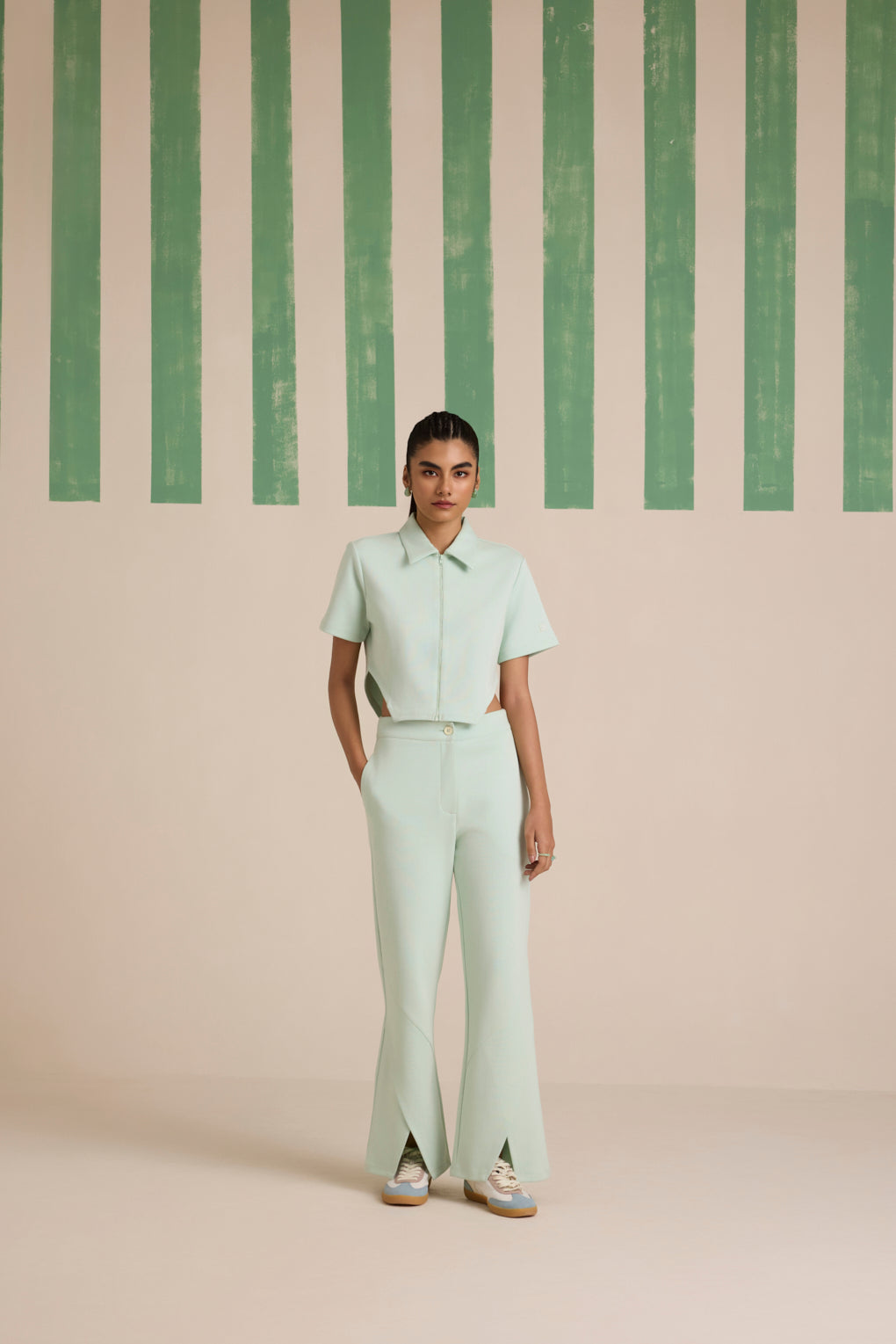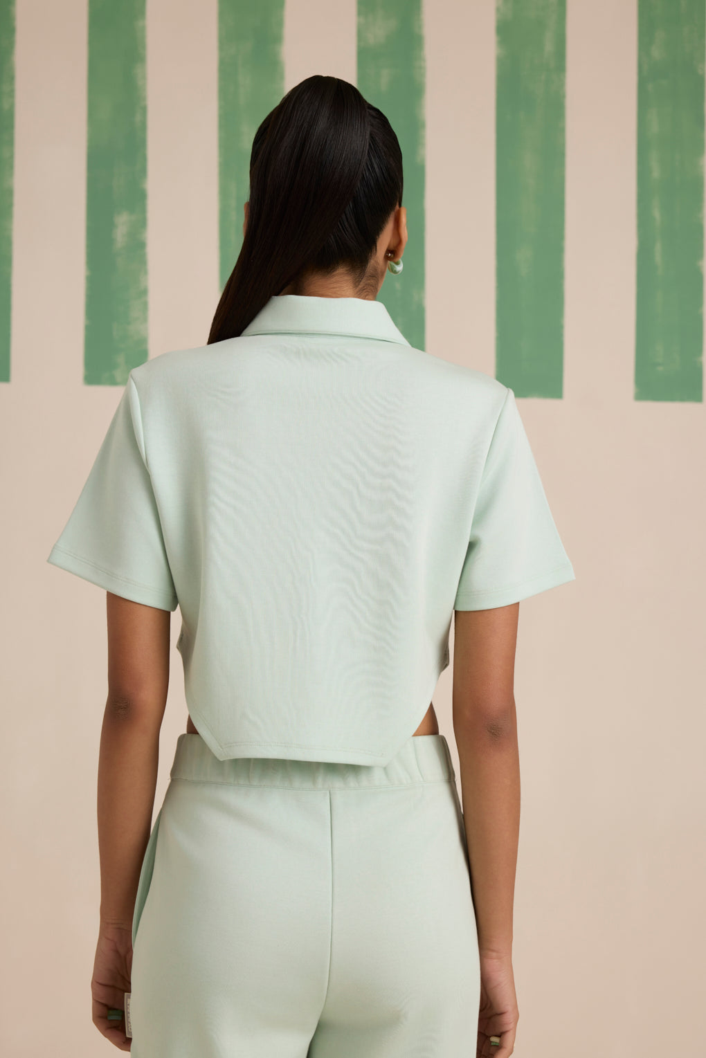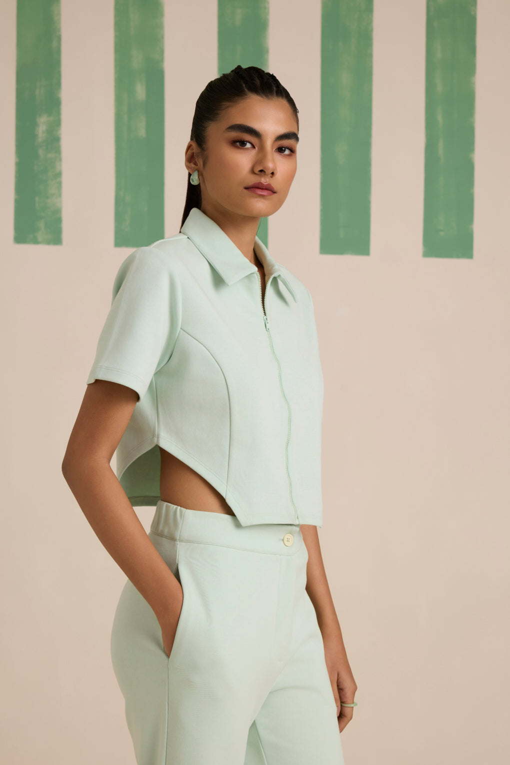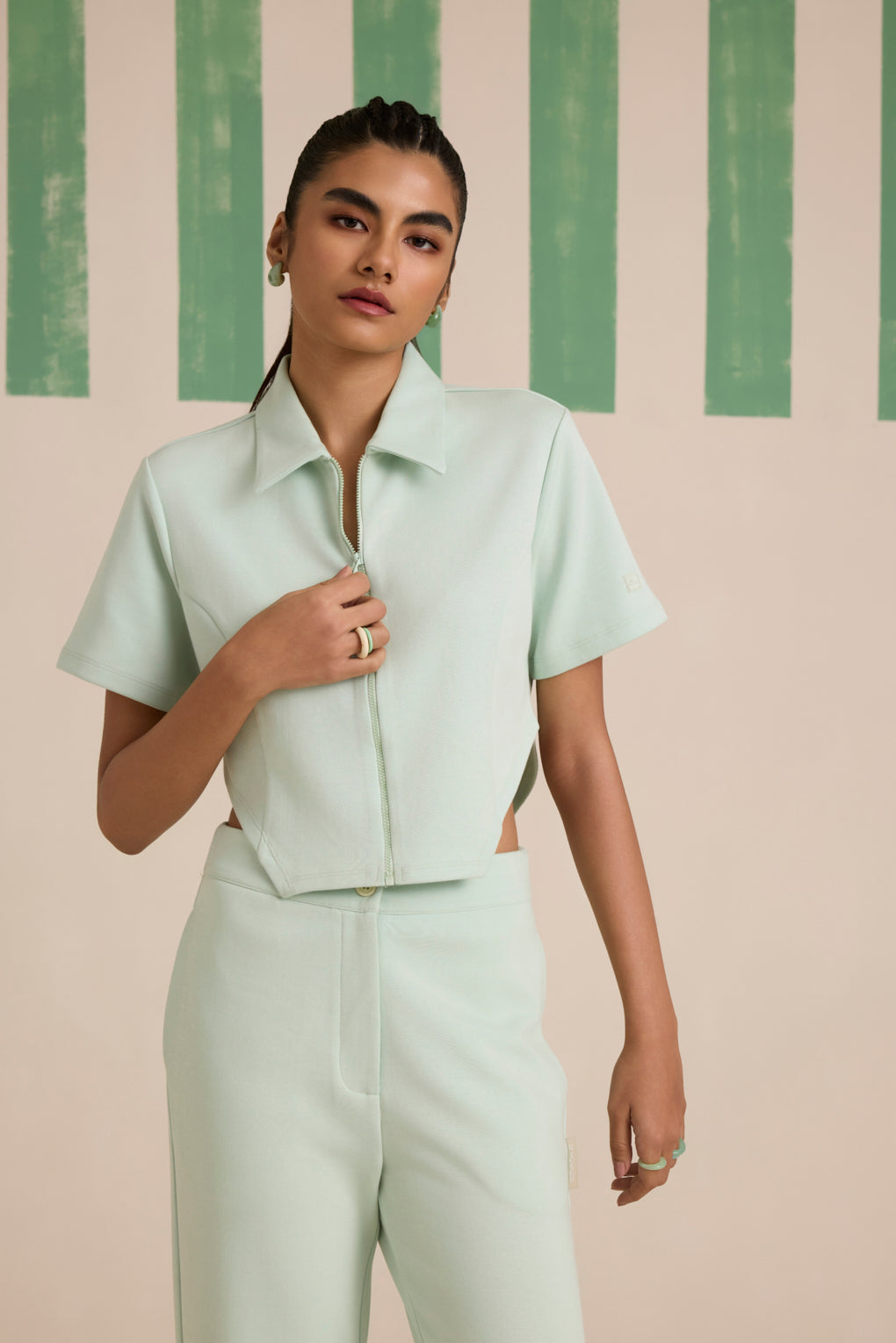 Upgrade your casual wear with this chic and breathable half-sleeve top, crafted in summer-friendly knit fabric for all-day comfort. Designed with stylish panel detailing, it features a unique U-shaped bottom cut that adds a modern touch. The collared neckline and front zipper opening bring a sporty yet sophisticated edge, making it a versatile addition to your wardrobe.