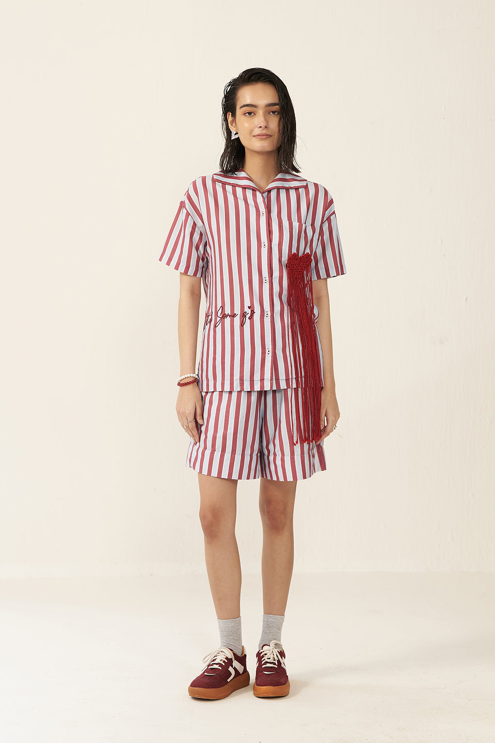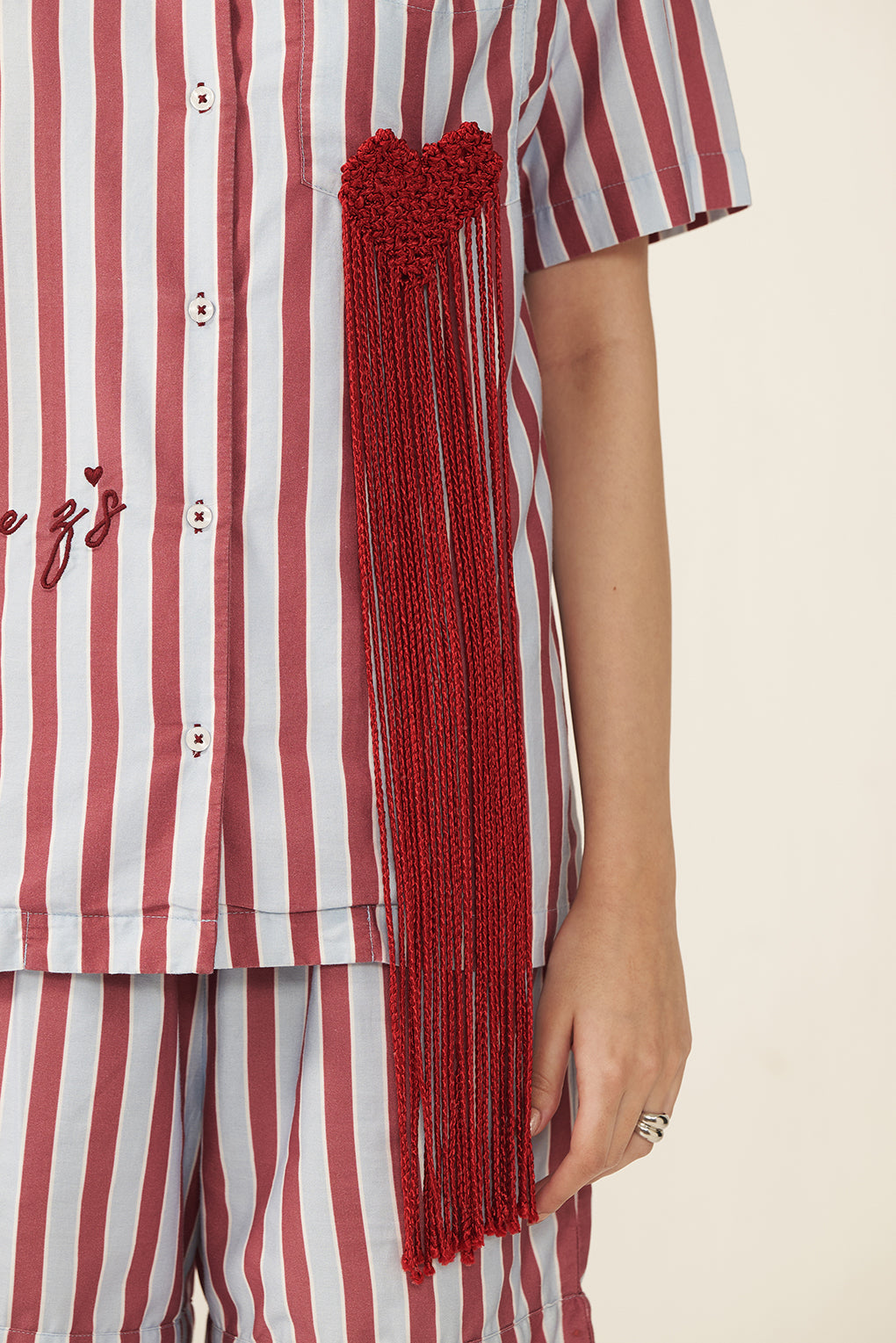- Design Detail/Trim: Viscose Macrame Heart Badge.