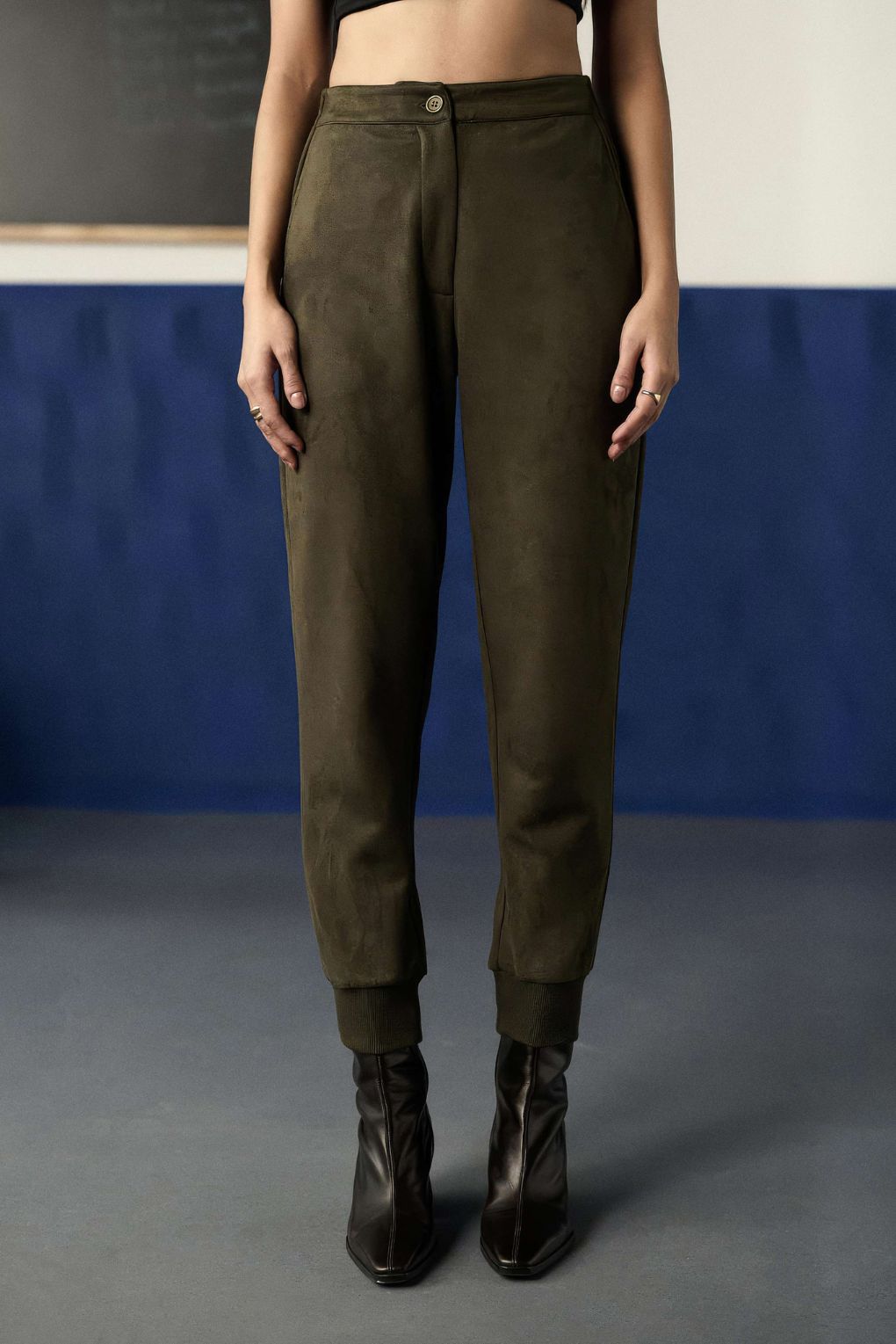 Blending structure with comfort, these women’s joggers are crafted in luxurious suede fabric for a refined, modern look. Designed with a front fly zipper and button closure, they’re finished with a comfort elasticated back waist for ease of wear. The addition of ribbed cuffs gives them a sporty edge while maintaining a polished silhouette—perfect for styling up or down.