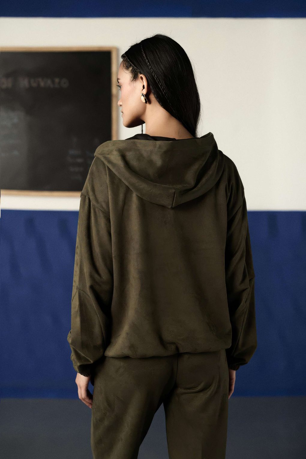 Crafted in luxurious suede fabric, this women’s sweatshirt redefines casual chic with elevated detailing. Featuring a relaxed hoodie design, it’s finished with pleat details at the bottom hem, creating a unique balloon fit silhouette. Soft, stylish, and versatile, it’s the perfect piece to add modern structure and cozy sophistication to chilly-day looks.